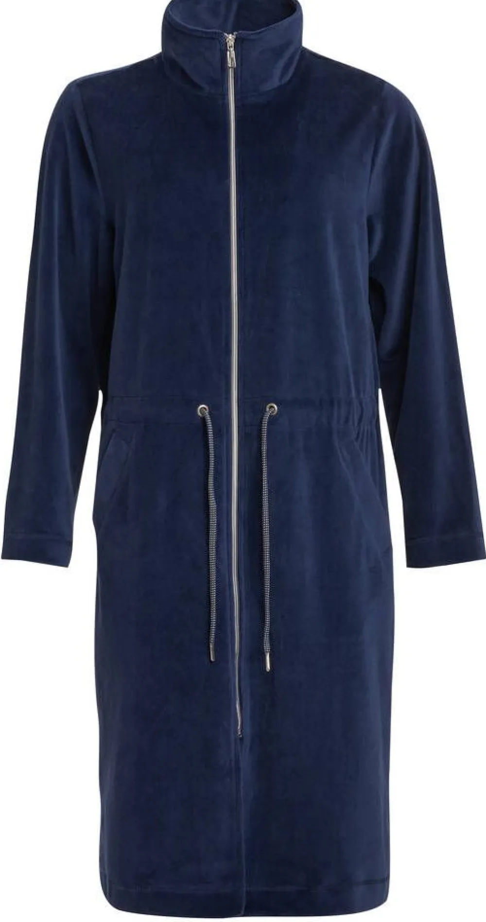 Vetoketjullinen aamutakki pystykauluksella. Vyötäröllä on muotoa antavat kiristysnauhat ja etupuolella kätevät tas…