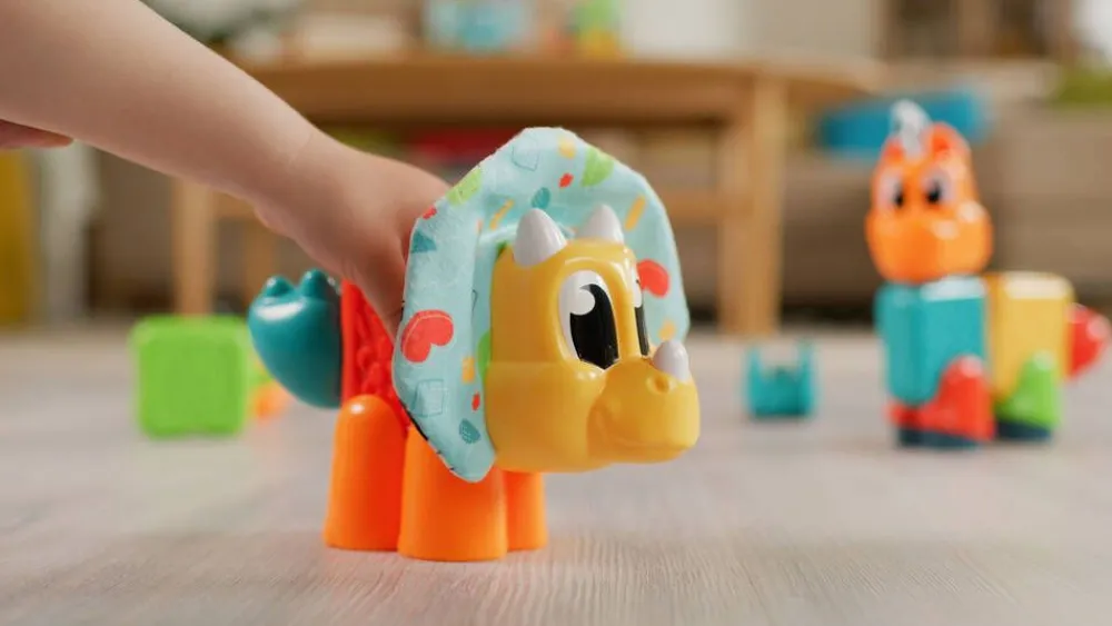 Dinosauruskaverukset kootaan taaperon käteen sopivista paloista. Mukana rapiseva, helisevä, vinkuva ja pehmeä palikka…