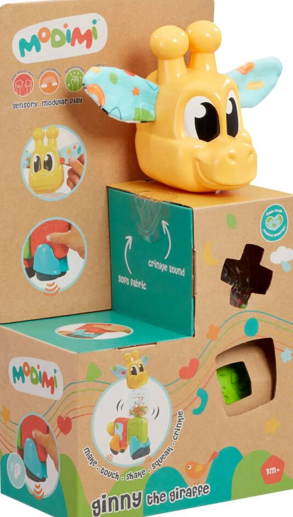Kiva kirahvilelu kootaan taaperon käteen sopivista paloista. Kirahvilla on rapisevat korvat ja yhdessä palikassa on …