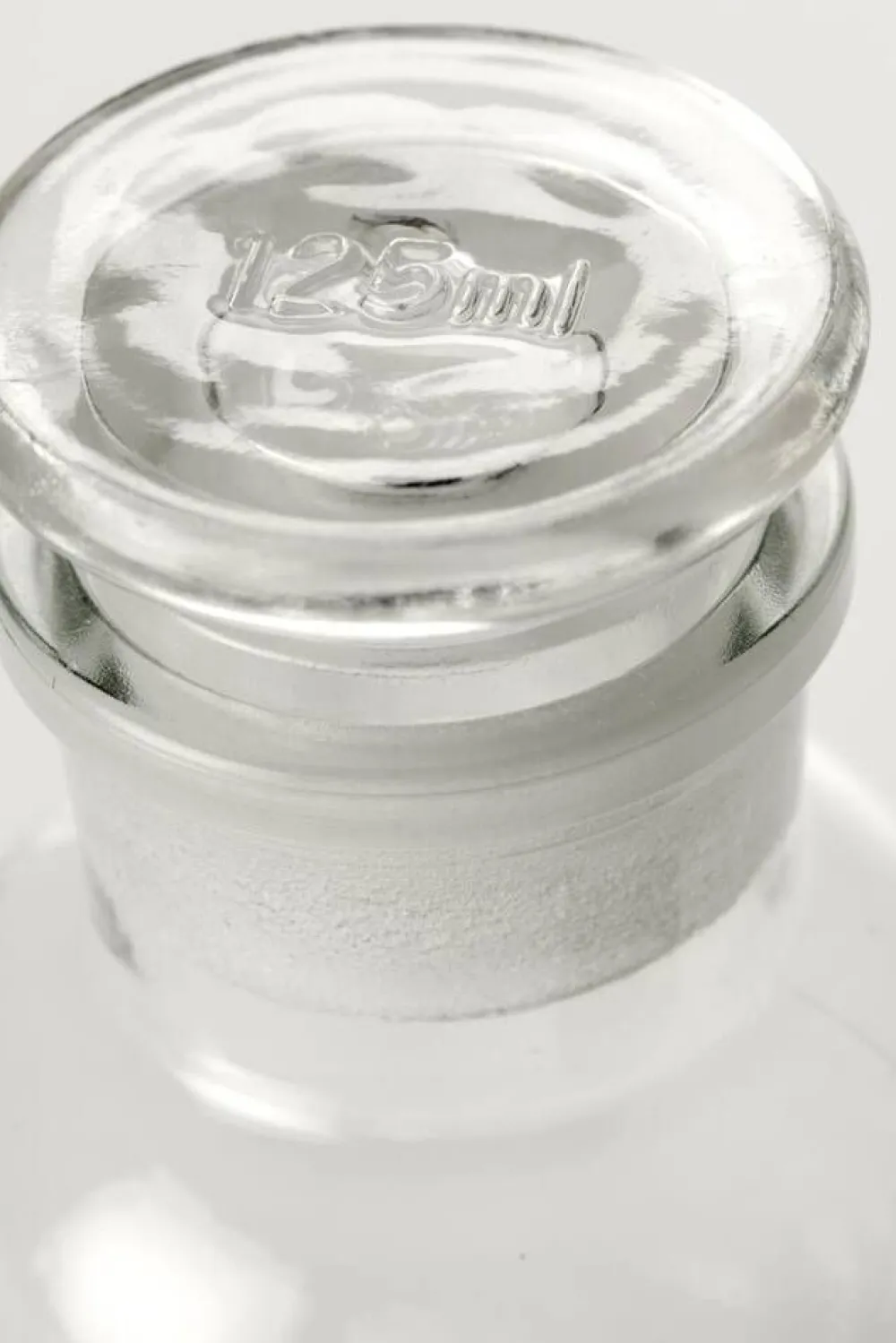 Klassinen apteekkipullo, jonka tilavuus on 125 ml. Hiottu lasikansi takaa tiiviin sulkemisen, ja ml-merkintä näkyy sel…