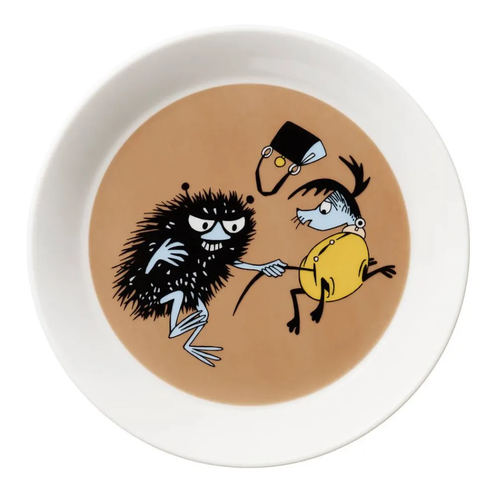 Haisuli-lautasen kuvituksessa nähdään Muumilaakson roisto, joka on kuitenkin tällä kertaa pelastamassa Muumimamman …
