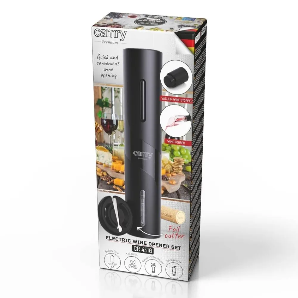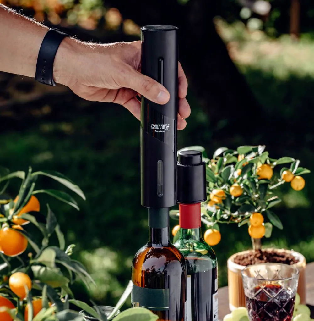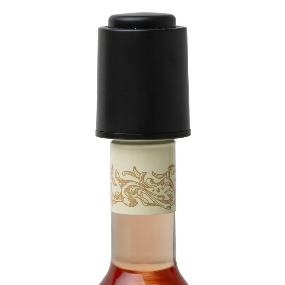 | Setissä on käytännöllinen folionleikkuri, joka poistaa tarkasti suojafolion mistä tahansa pullosta. |