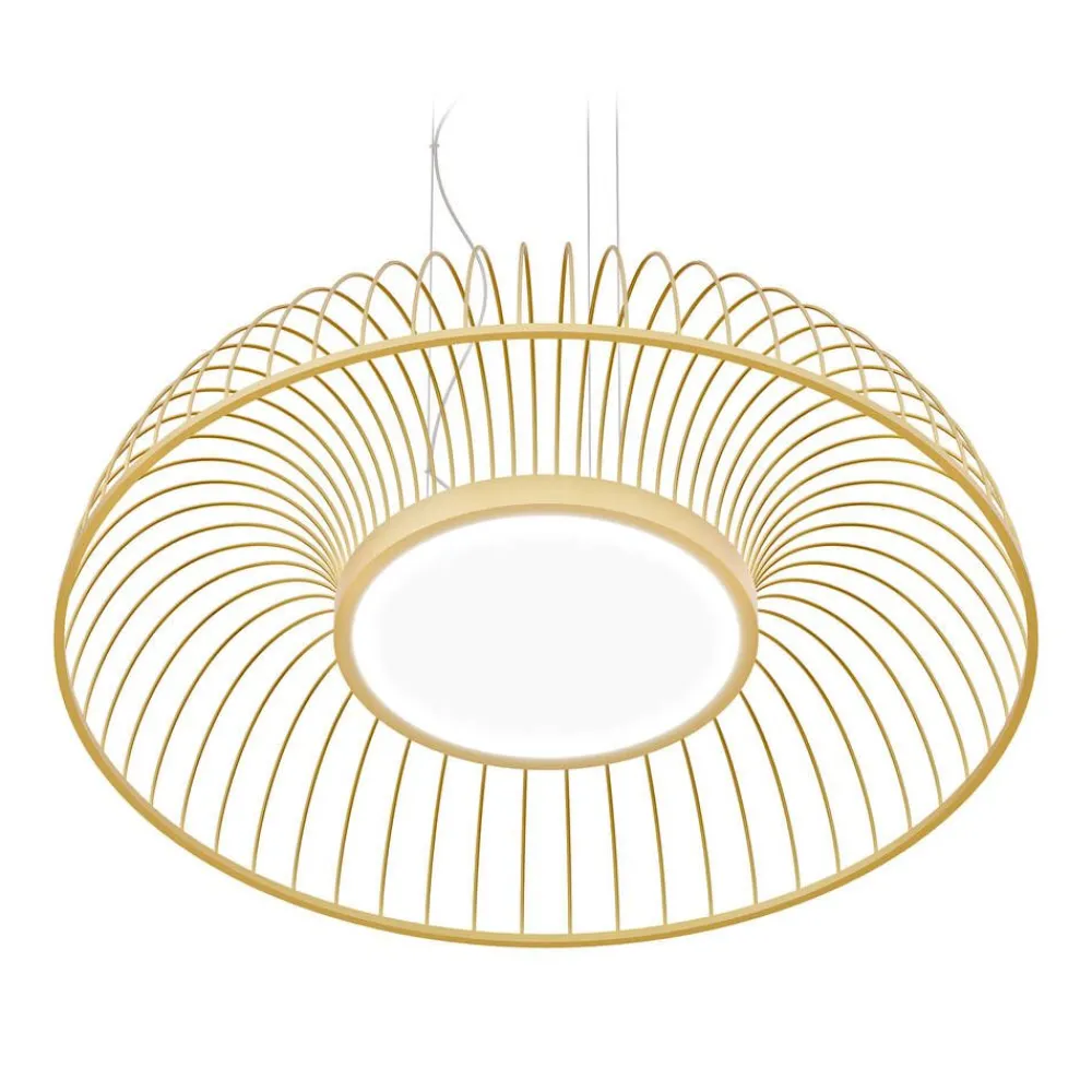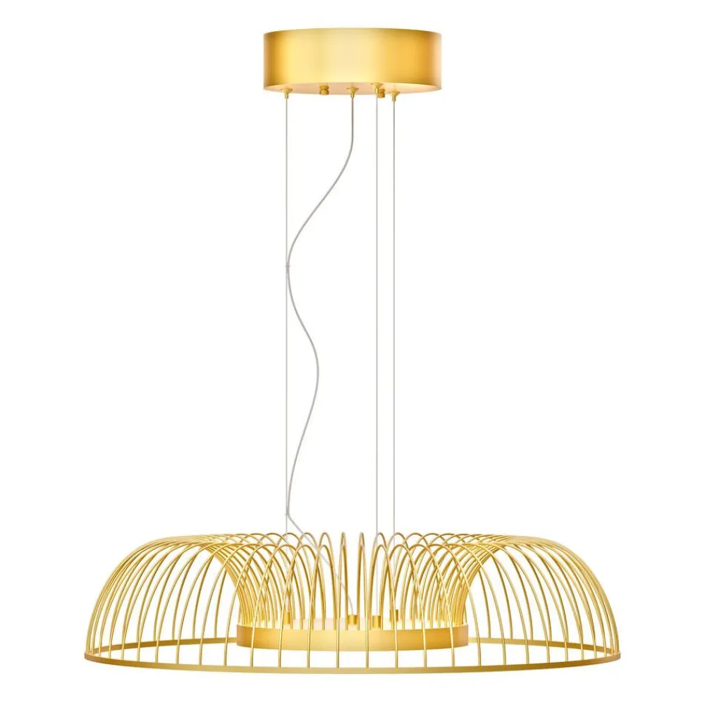 | Avoin messinkinen metallikehikko korostaa valaisimen kolmiulotteista muotoa tehden siitä visuaalisesti kevyen. |