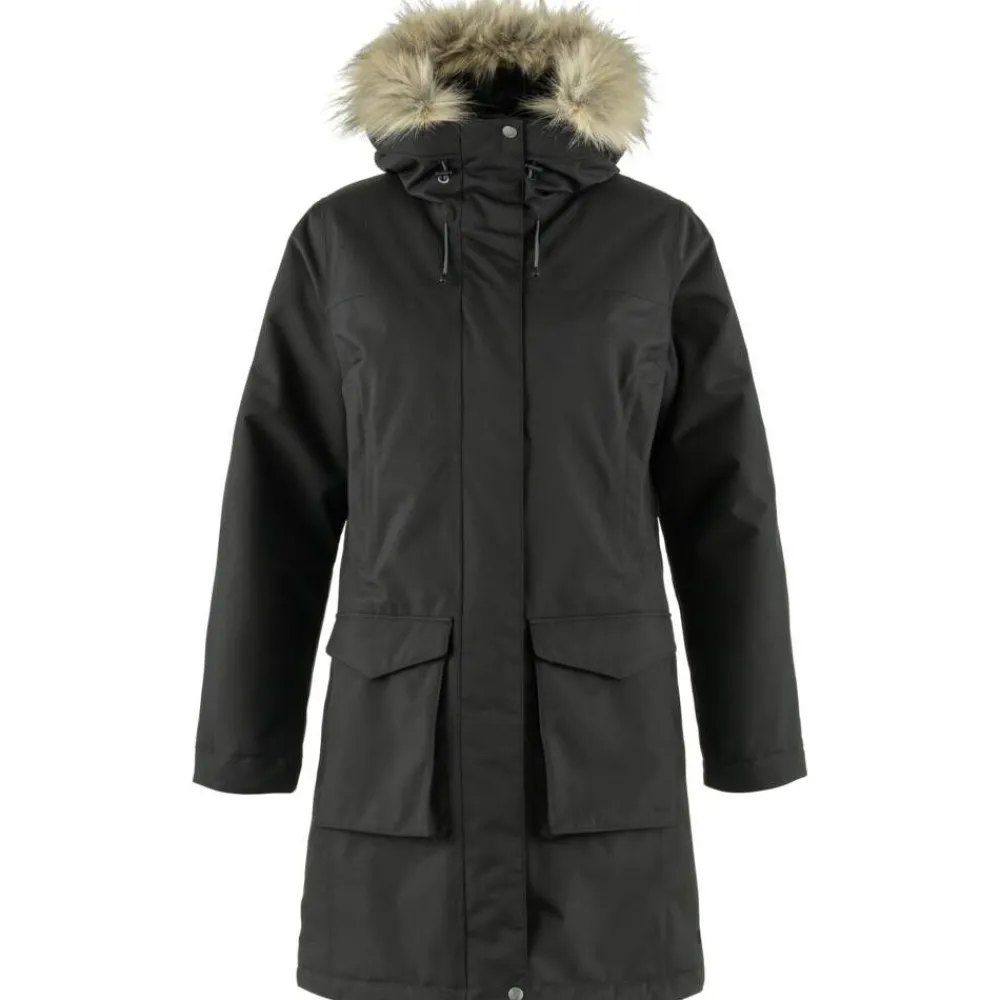 | Säädettävä suojahuppu irrotettavalla tekoturkisreunuksella ja edessä kaksisuuntainen vetoketju, jossa on nepparikiinnitteinen tuulilista |