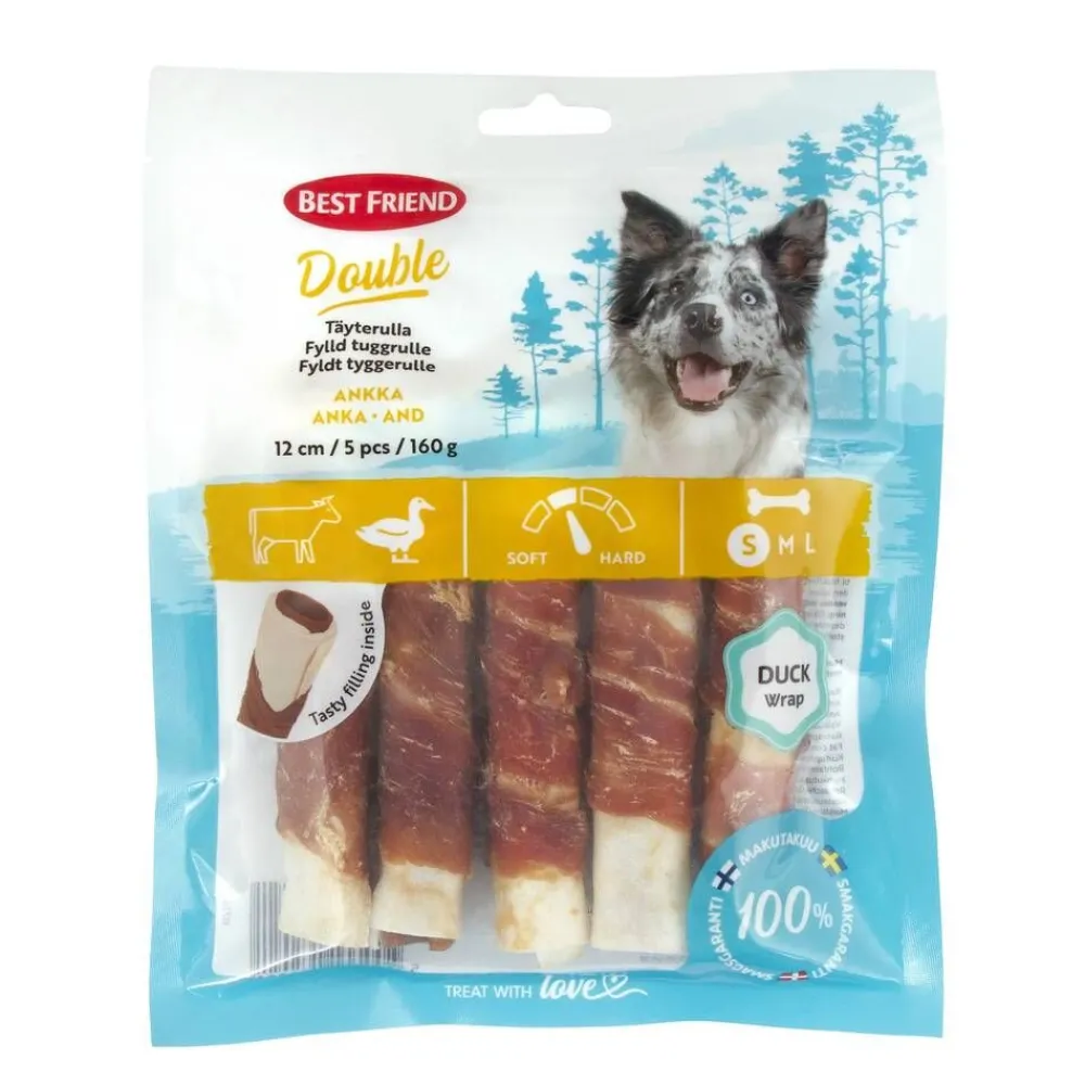 | Koostumus: naudannahat (32,0 %), ankka (23,0 %), riisijauho, gelatiini, maapähkinäproteiini, glyseroli, suola. Lisäaineet: Sorbitoli, kaliumsorbaatti, EU väriaineet. |