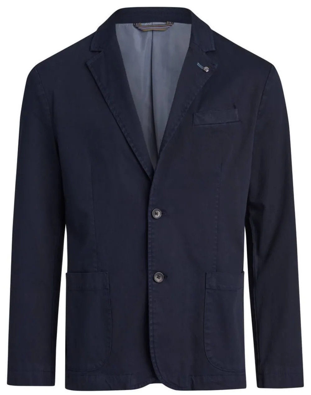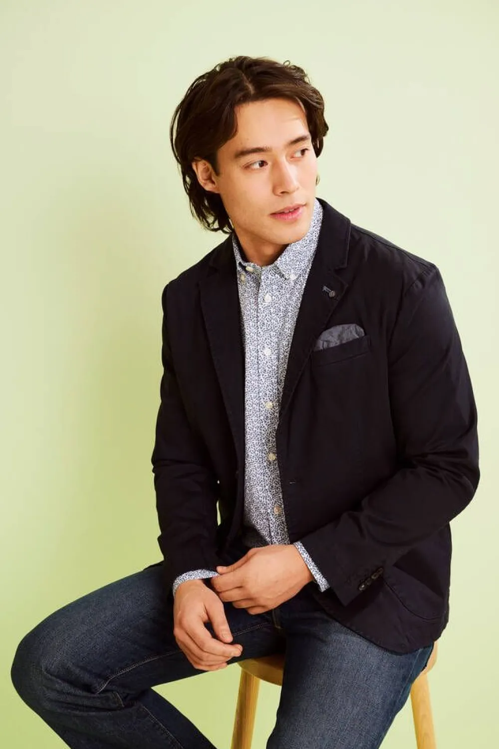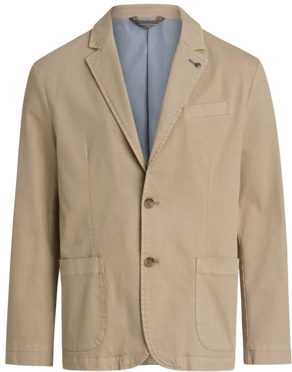 Trendikäs kangasblazer modern fit-istuvuudella. Edessä on kaksi tummaa nappia ja kauluksessa raidallinen pieni persoon…