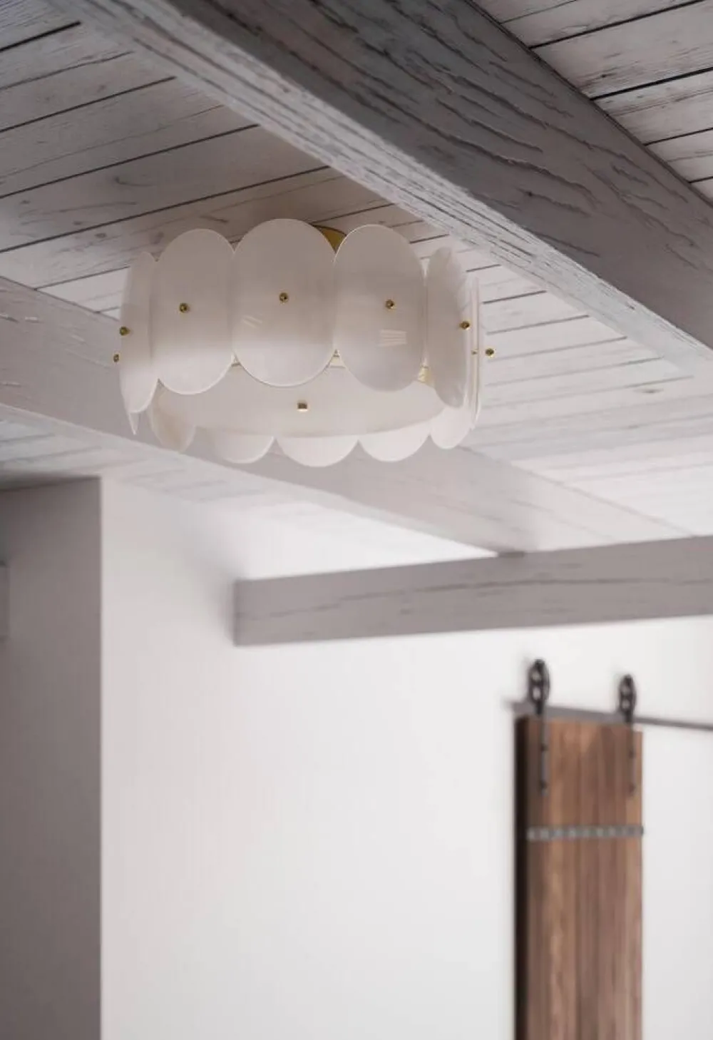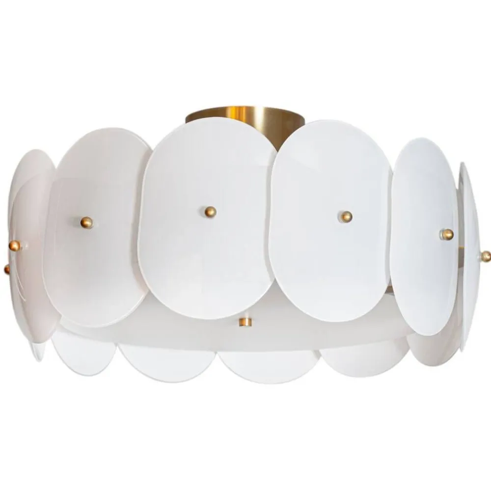 Mia Lagermanin muotoilema plafondi erottuu omaperäisellä muotokielellään, jossa kiiltävä valkoinen lasi ja messink…