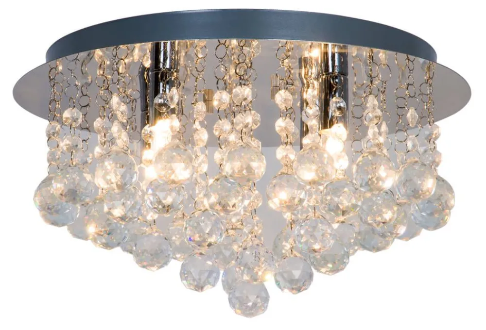 Tyylikäs ja helposti asennettava krominen kattoplafondi säihkyvillä lasikoristeilla. Kattokoukkukiinnitys ja pistotul…