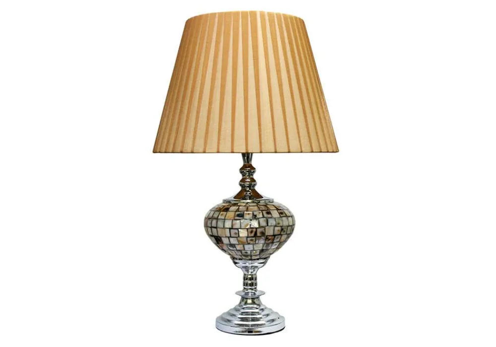 Tyylikäs pöytävalaisin, jossa helmiäissimpukkaisia kauniita yksityiskohtia. Upea pliseraattu kangasvarjostin.Lisää…