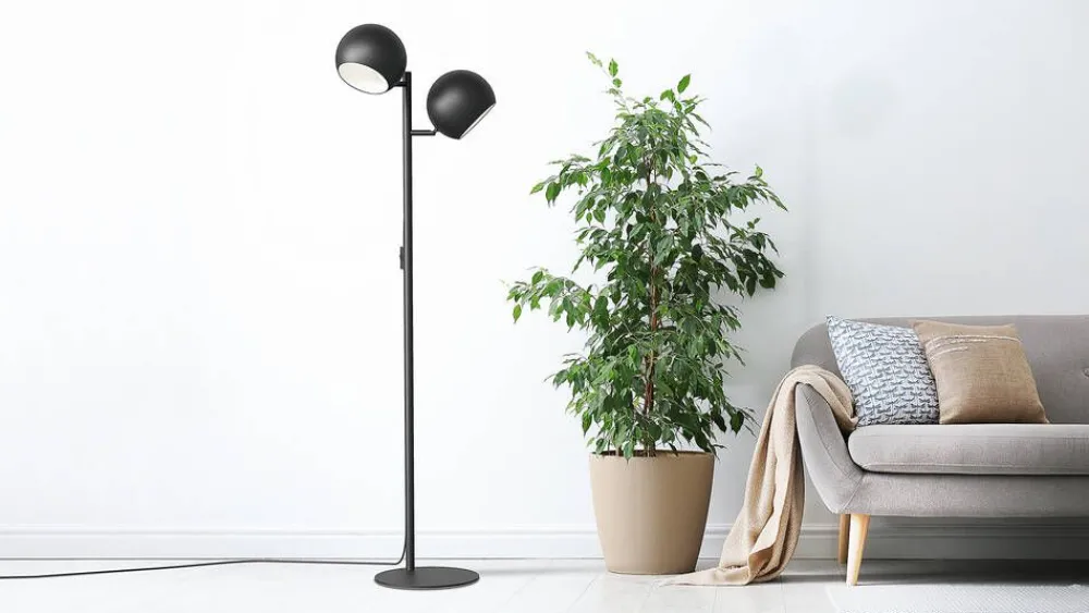 Round-lattiavalaisimen runko on mustaksi maalattua metallia, ja kuvun sisäpuoli on vaalea valon määrän maksimoimisek…