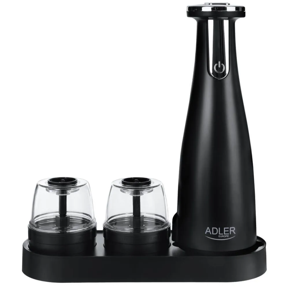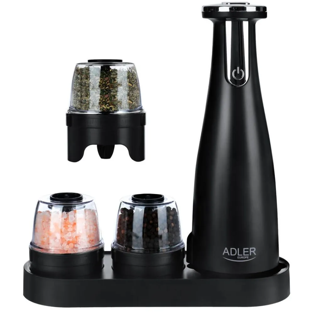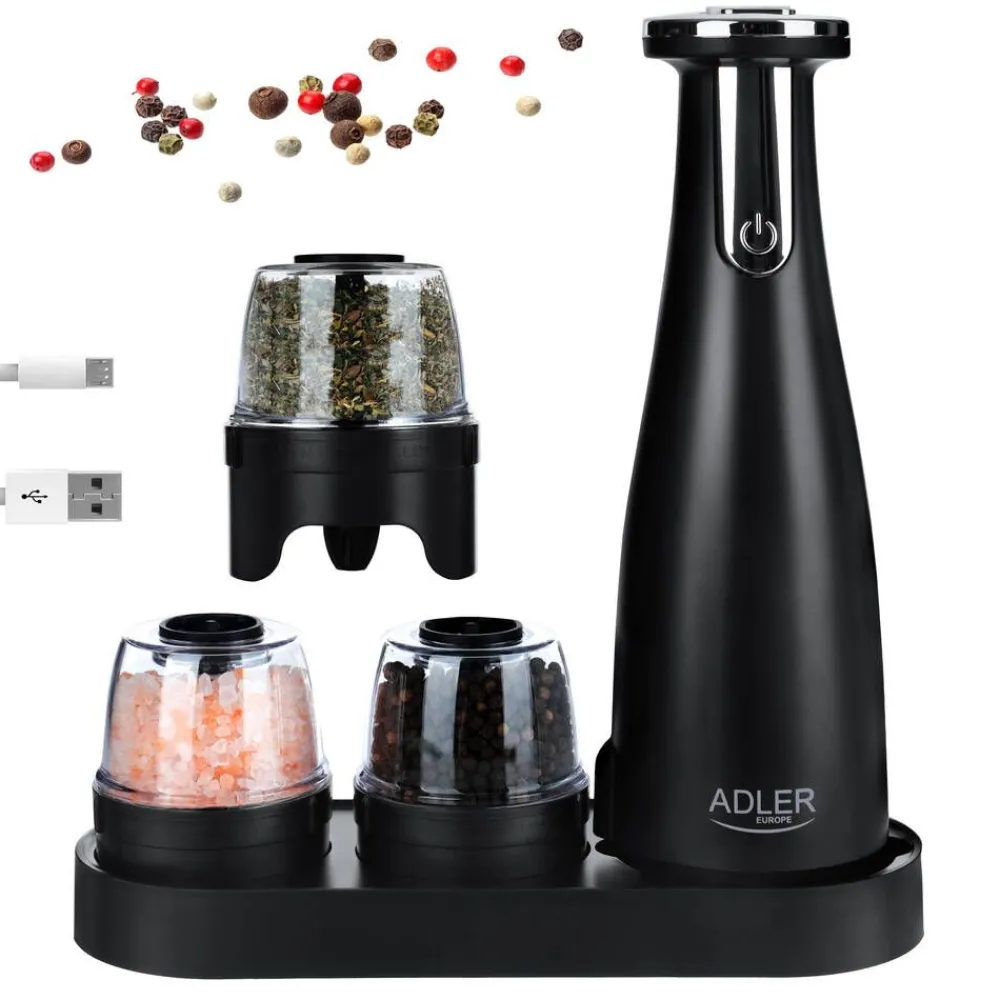 | Yhden myyntipakkauksen sisältö:Pohja, 3 vaihdettavaa myllyä, alusta, USB-latauskaapeli |