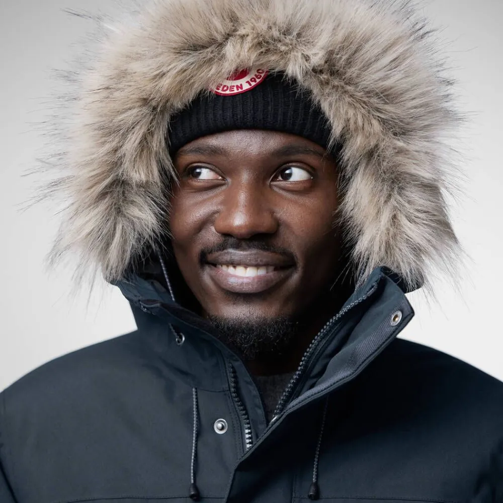 | Säädettävä suojahuppu irrotettavalla tekoturkisreunuksella ja edessä kaksisuuntainen vetoketju, jossa on nepparikiinnitteinen tuulilista. |