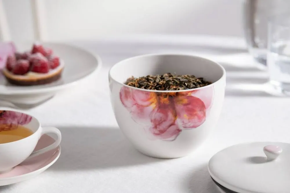 Rose Garden -malliston herkät akvarellimaiset ruusunkukat ovat tämän vuoden ehdoton trendi. Tarjoile romanttinen teehetki tai makeiset tällä purkilla. Valmistettu Saksassa astianpesukoneen ja mikroaaltouunin kestävästä Premium posliinista.