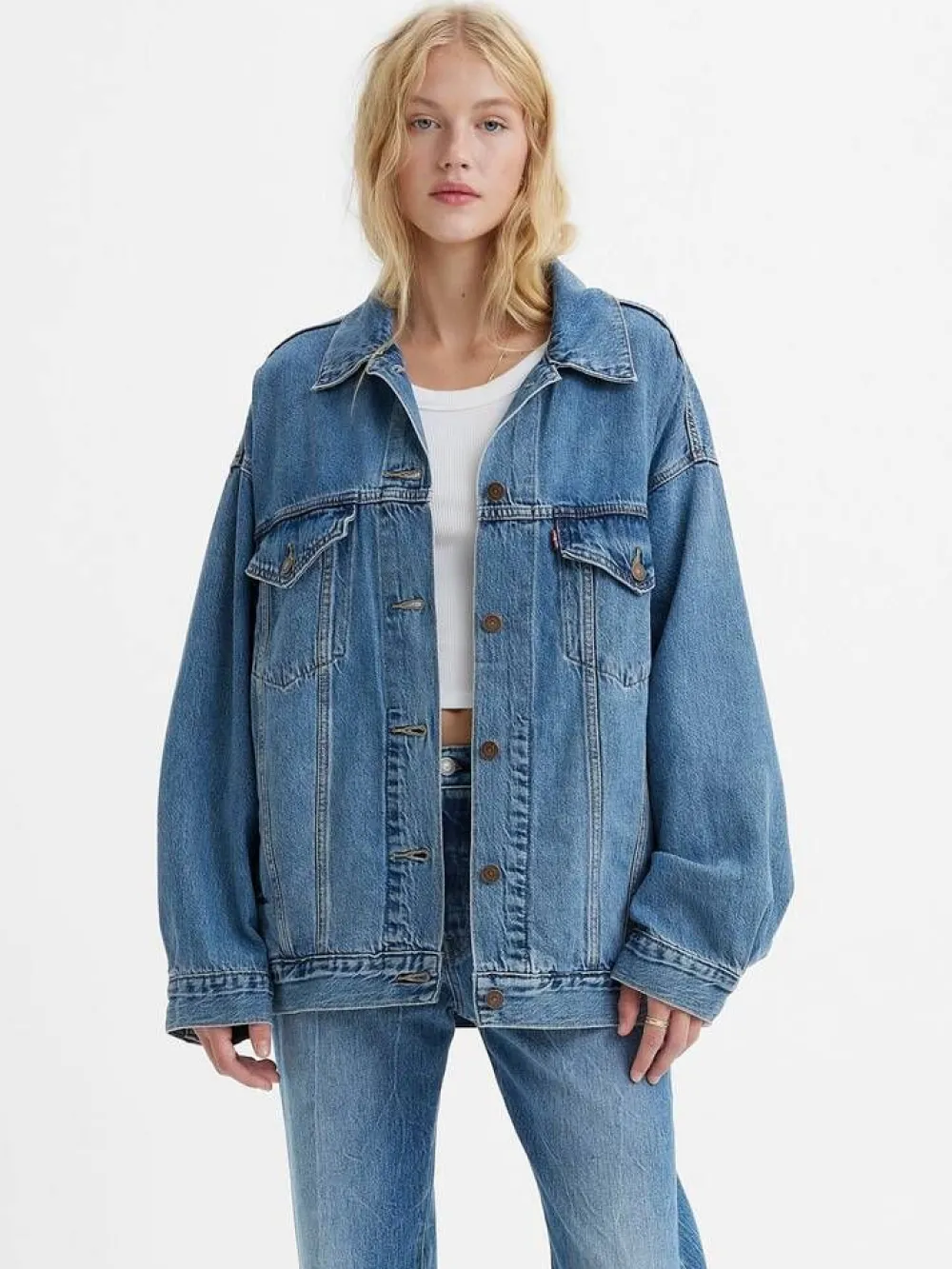 Supertrendikäs retrohenkinen väljänmallinen farkkutakki. Edessä on syvät taskut ja nappikiinnitys.Lisää tietojaKi…