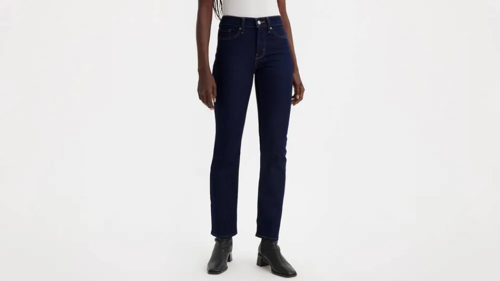 Tasaisesti tummansiniset farkut suoralla lahkeella. Myötäilevän vyötärön korkeus on normaali.Lisää tietojaIstuvu…