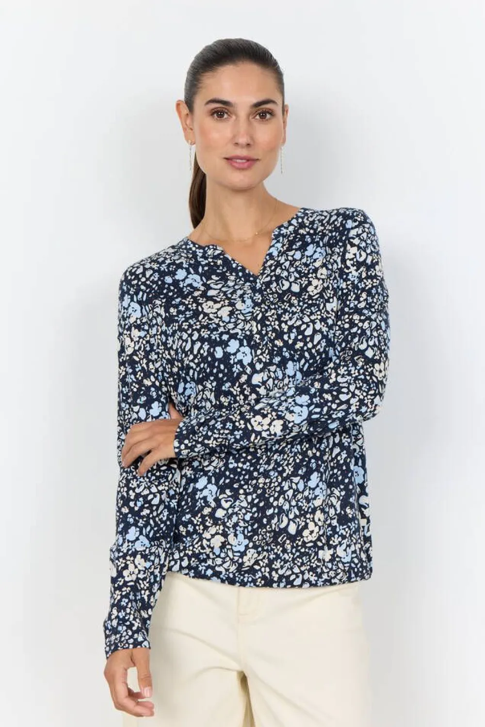 Rento trikoopaita kauniilla kukkakuosilla, V-pääntiellä ja helman kuminauhalla. Yhdistä siisteihin housuihin tai kla…