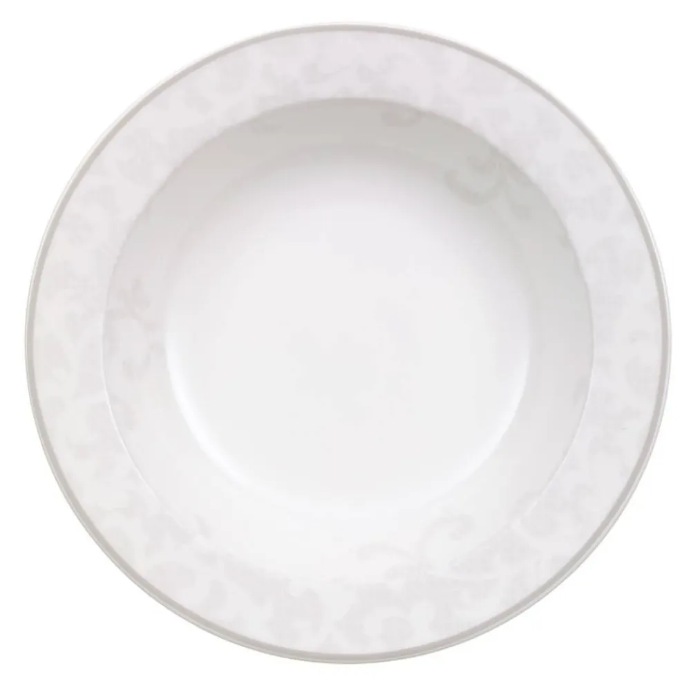 Gray Pearl astiasto on ylellistä, vitivalkoista luuposliinia. Koristeluna herkkä helmen harmaa siirtokuva ja lautasosi…