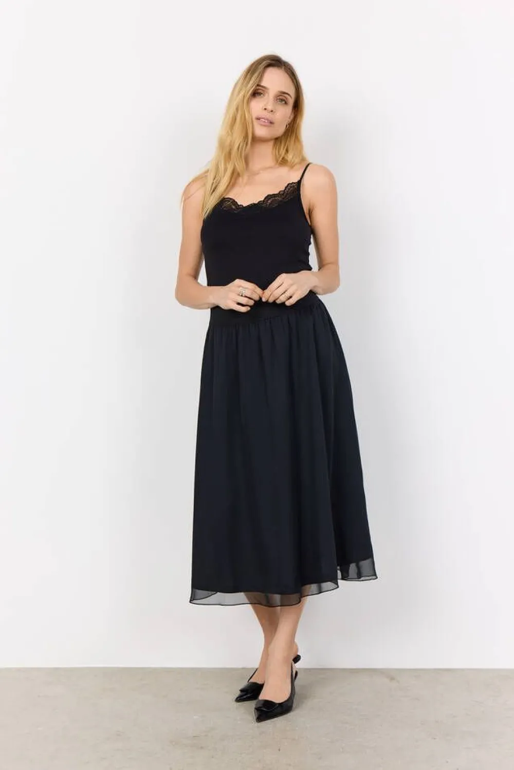 Juhlava puolipitkä sifonkihame joustavalla kuminauhavyötäröllä. Helposti yhdisteltävä, helposti puettava.Lisää …