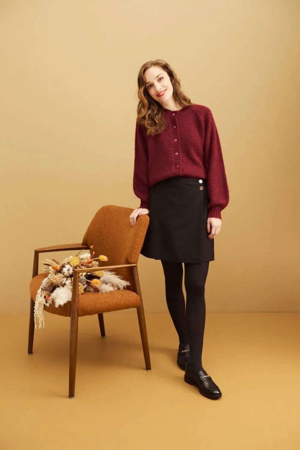 Tyylikäs kietaisumallinen minihame kahdella kullanvärisellä napilla. Hameessa on avoimet sivutaskuta ja ohut vuorikan…