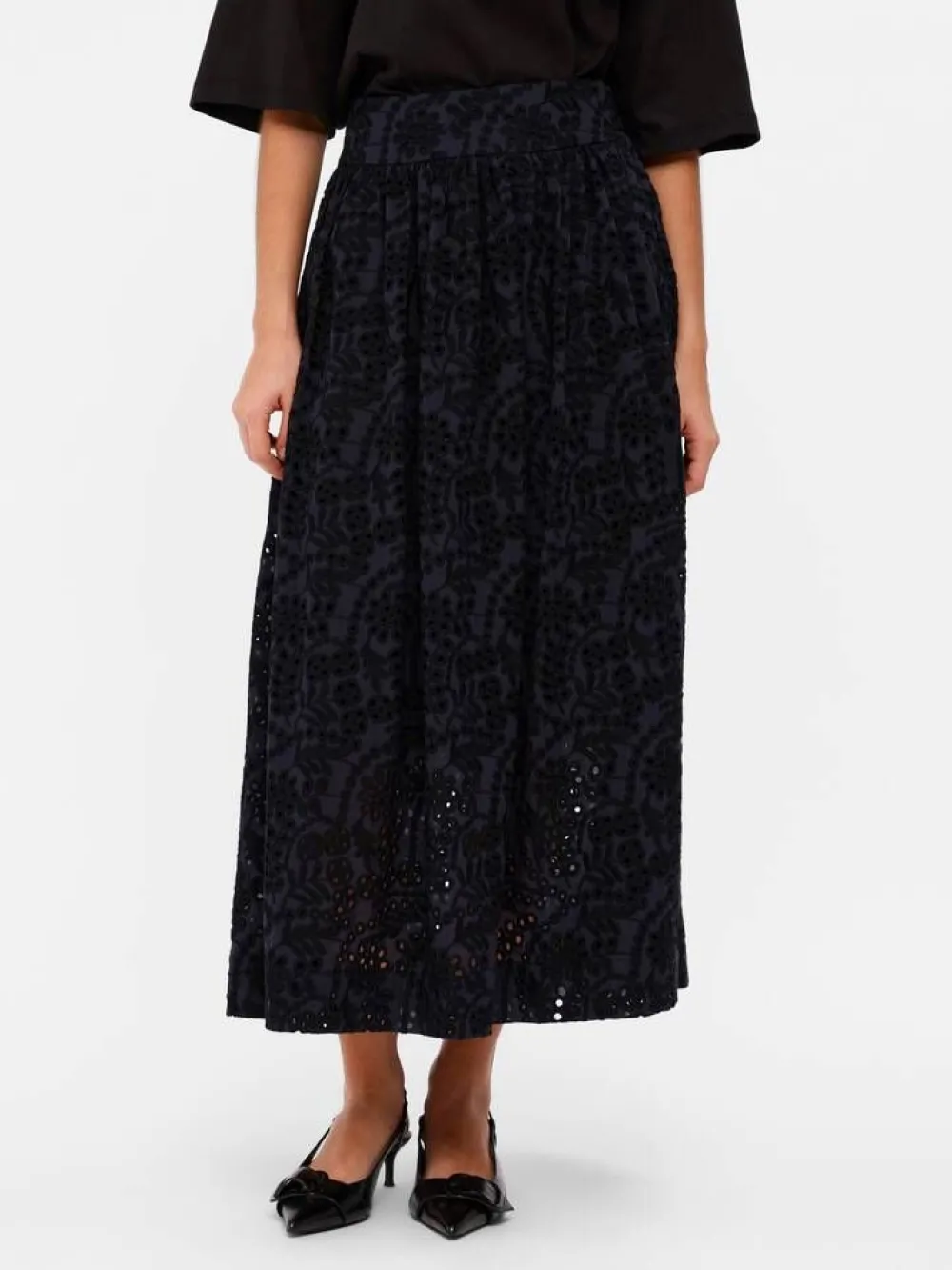 Midimittainen hame brodeeratulla kuvioinnilla. Vyötäröllä on solmittava vyö.Lisää tietojaHoito-ohje:Vesipesu 30Ma…