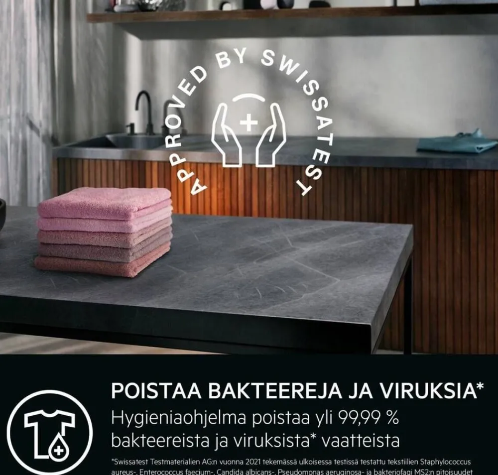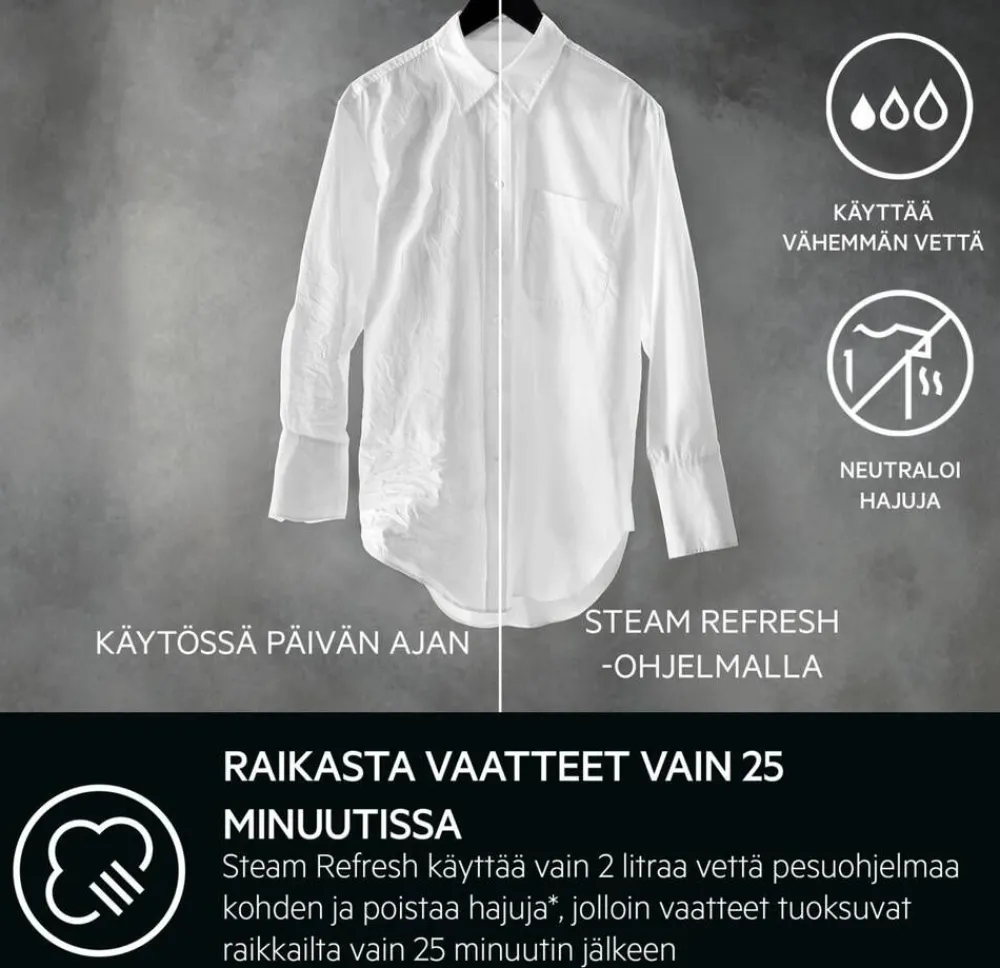 | Pesuohjelmat:PowerClean 59min, Eco 40-60, Puuvilla, Keinokuidut, Hienopesu, Villa, 20min 3Kg, Höyry, Koneen puhdistus, Hygiene, Huuhtelu, Huuhtelu/tyhjennys. Lisävalinnat: Lisähuuhtelu |