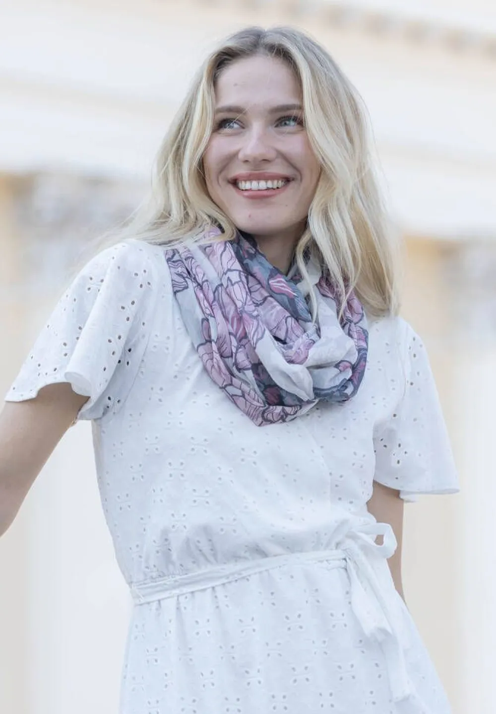 Kevyt kukkatuubihuivi ihanan pehmeää 100% lyocell-kuitua. Pituus riittää kietomaan kaksi kertaa kaulan ympäri.Lisä…