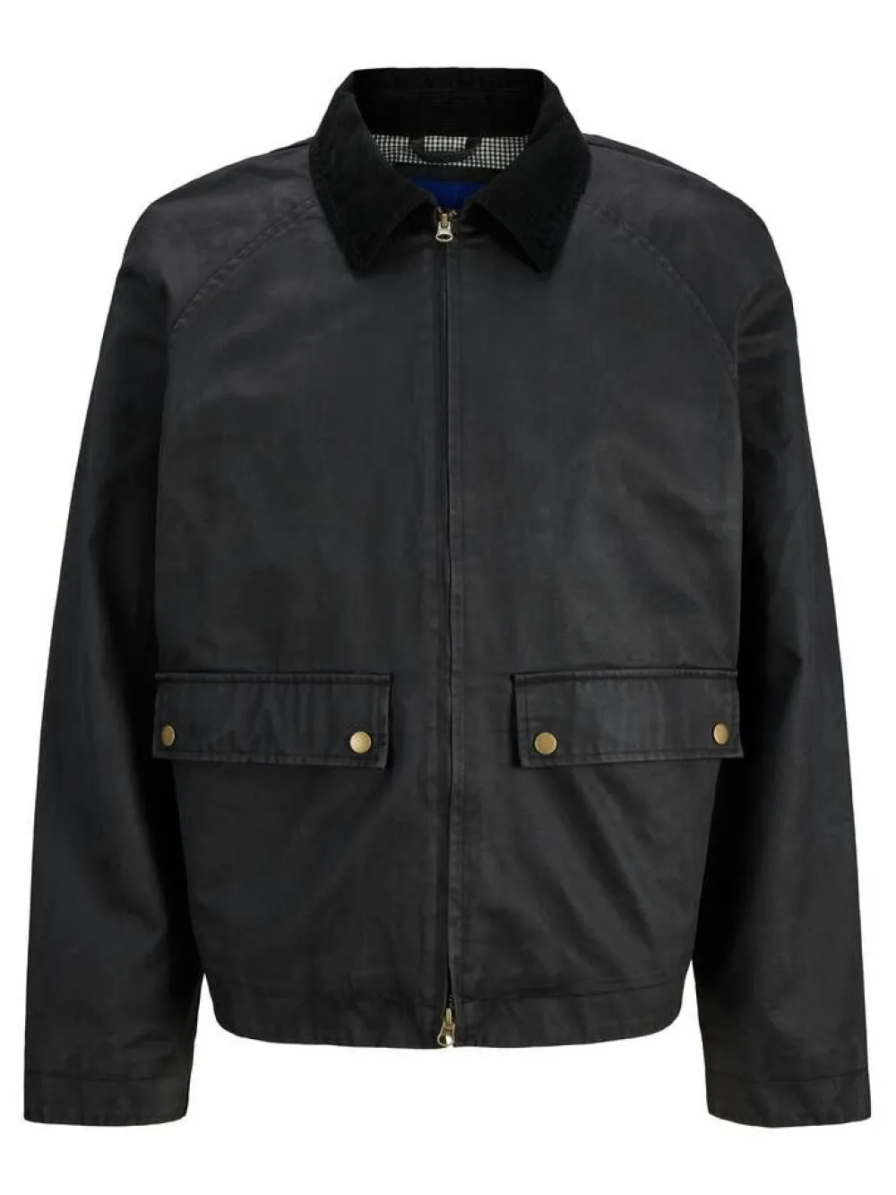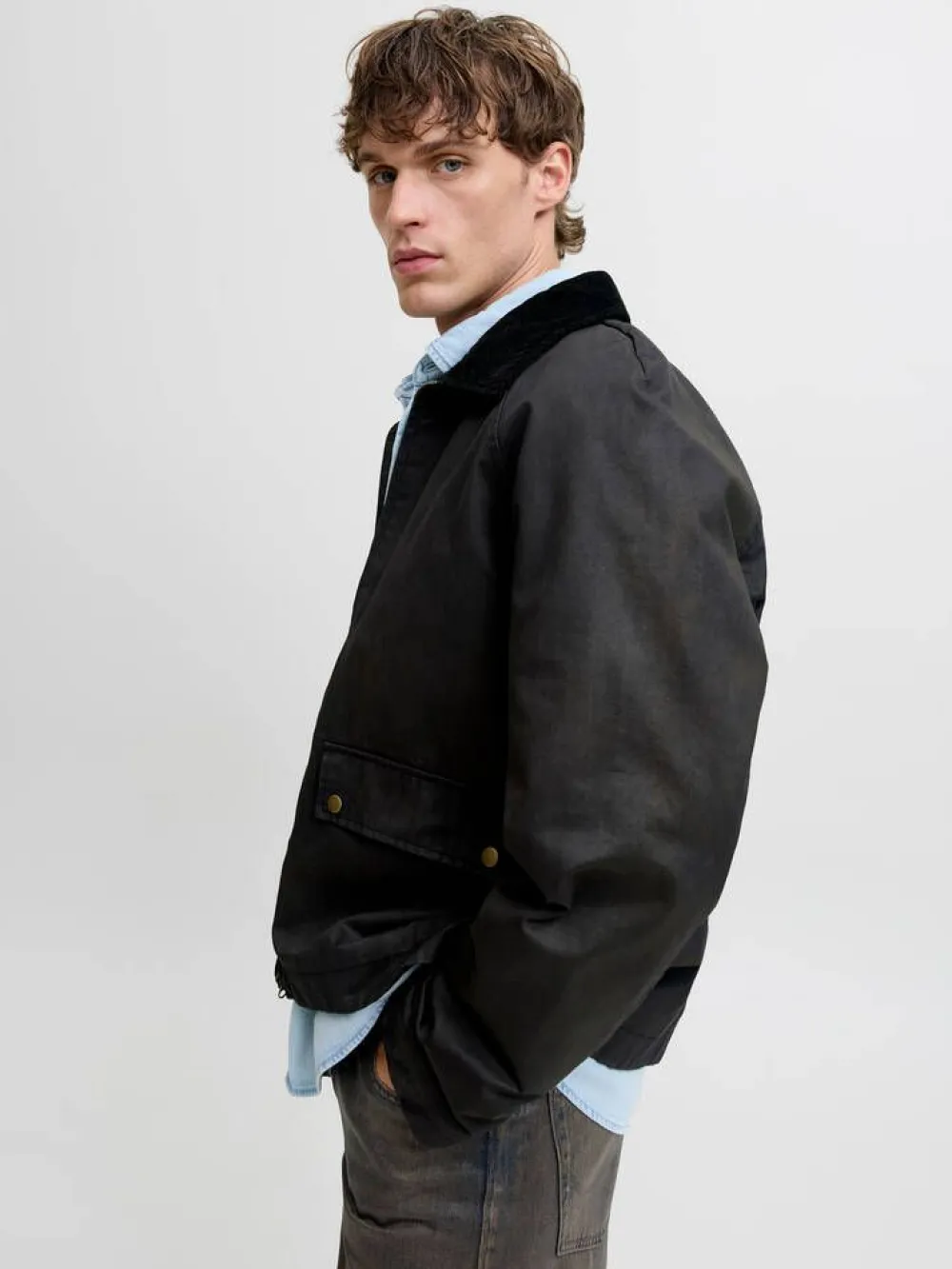 Tyylikäs takki vahatulla pinnalla, joka luo ajattoman ilmeen. Samettinen kaulus. Edessä on läppätaskut nepparikiinni…
