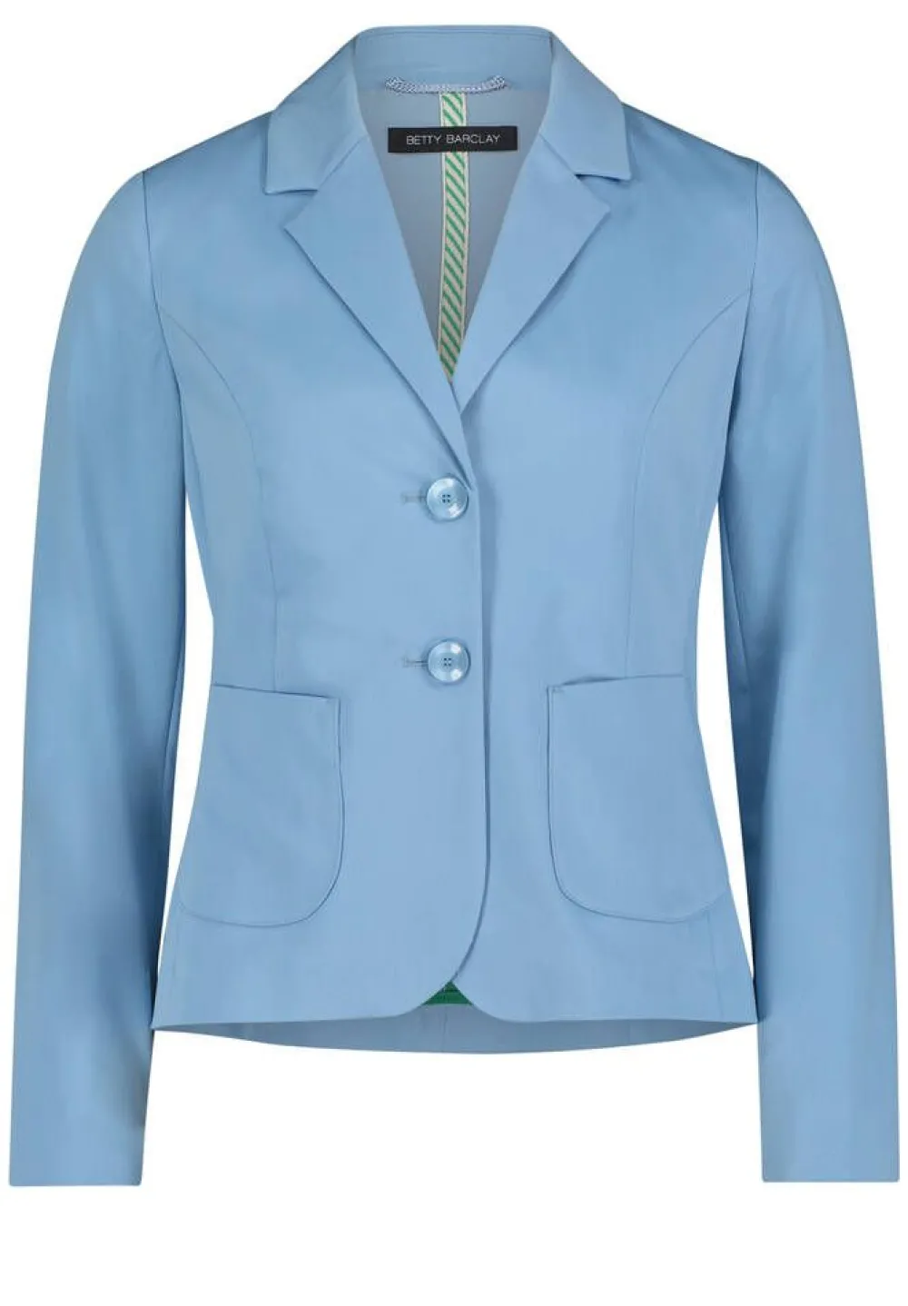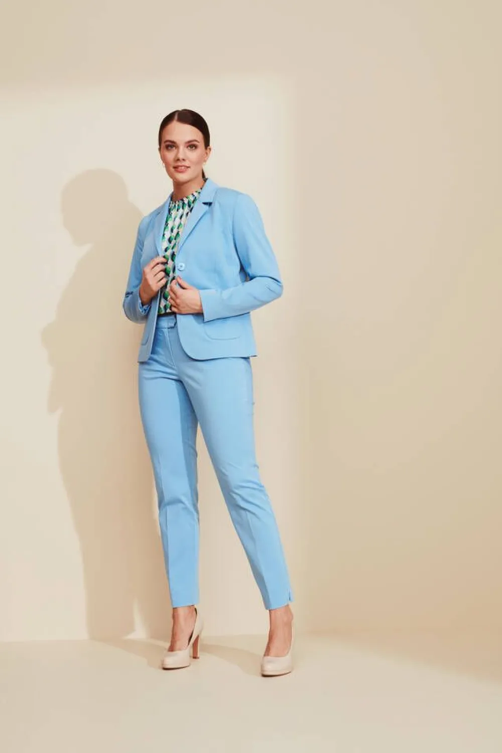 Naisten tyylikäs perusjakku hempeässä sinisen sävyssä. Tyylikkään kokonaisuuden saatu yhdistämällä jakun housu…