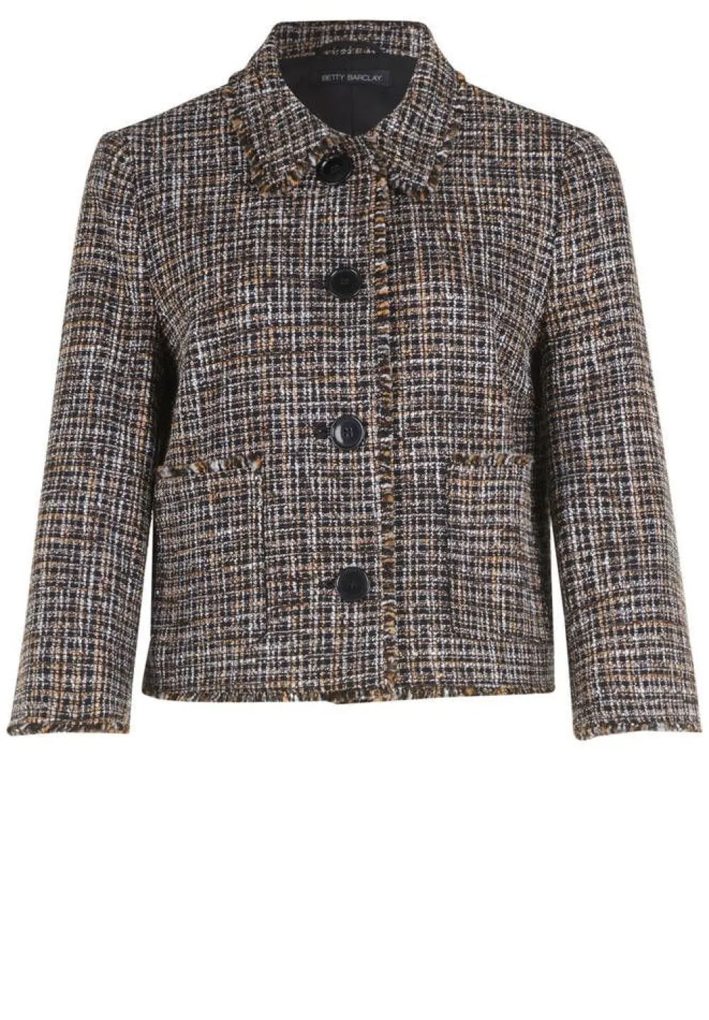 Ajattoman tyylikäs tiheällä ruutukuosilla koristettu napitettava takki. Malli on lyhyt ja myös vajaamittaiset hihat …