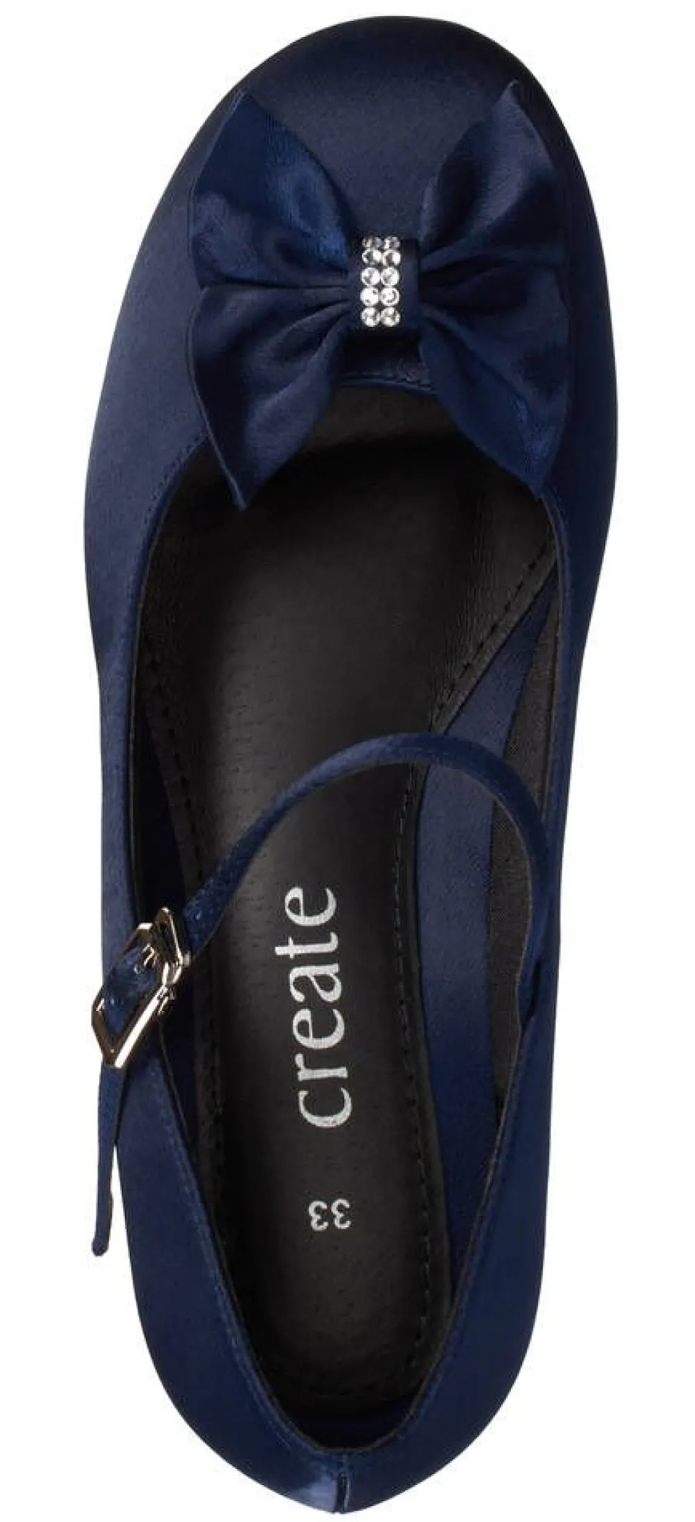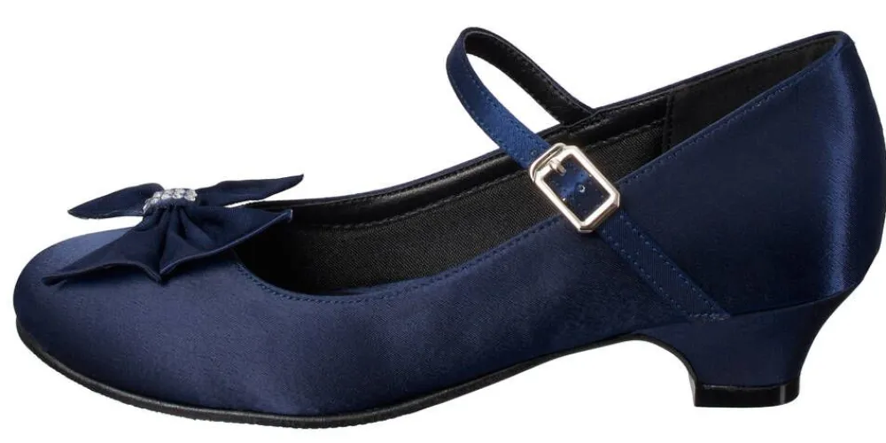 Satiinipintaiset juhlakengät matalalla korolla. Kenkien päällä on näyttävä rusetti ja käyttömukavuutta lisääv…