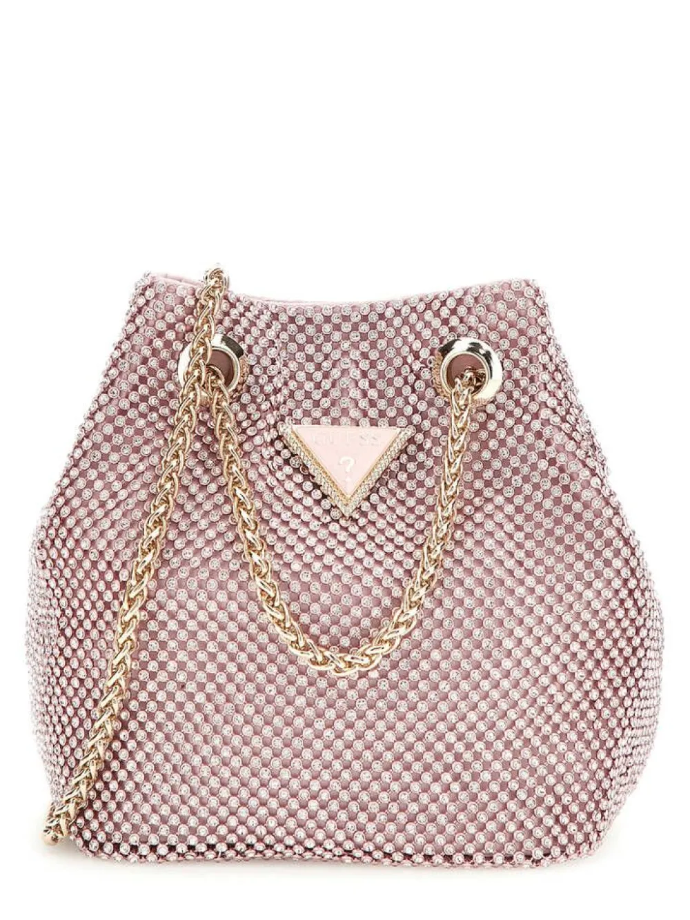 Näyttävä vaaleanpunainen glitterlaukku ketjuolkahihnalla. Edessä on tyylikäs Guess-kolmiologo.Lisää tietojaKiinni…