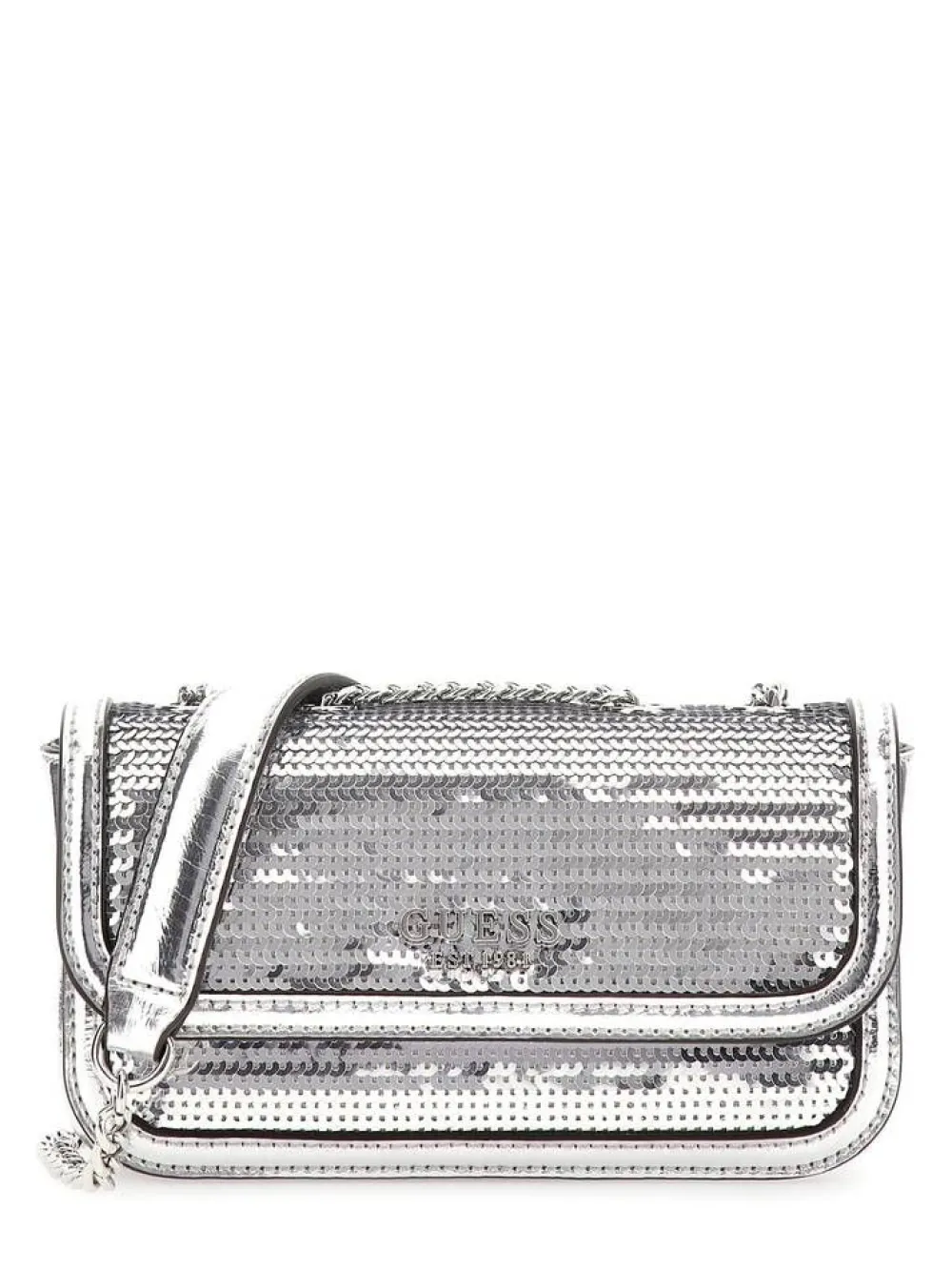 Paljettipintainen juhlalaukku etupuolen tekstilogolla. Olkahihna on osittain ketjua.Lisää tietojaKiinnitys:MagneettiMa…