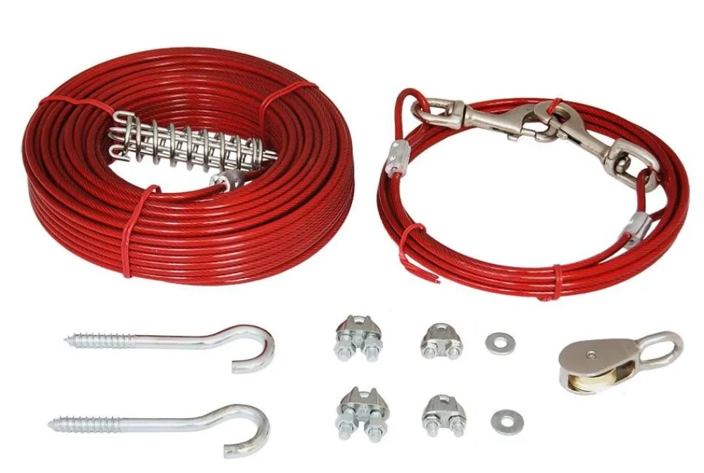 Vahvaa ja kestävää, muovipäällysteistä vaijeria. Mukana 3 m pitkä talutinosa, jonka molemmissa päissä on pistoo…
