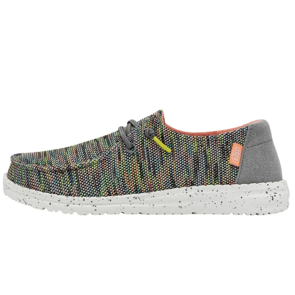 Rennot kangaskengät kirjavalla päällisellä ja harmailla nauhoilla. Kengissä on harmaa kanta ja roiskekoristeltu ulk…