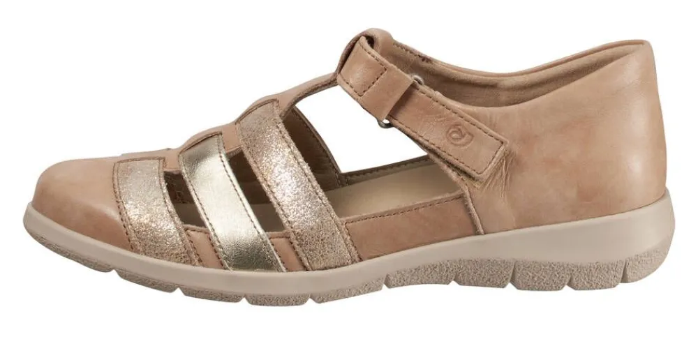Umpikantaiset sandaalit, joissa on avonaisissa sivuissa kultaiset koristukset ja tarrasolki. Kengässä on irrotettava p…