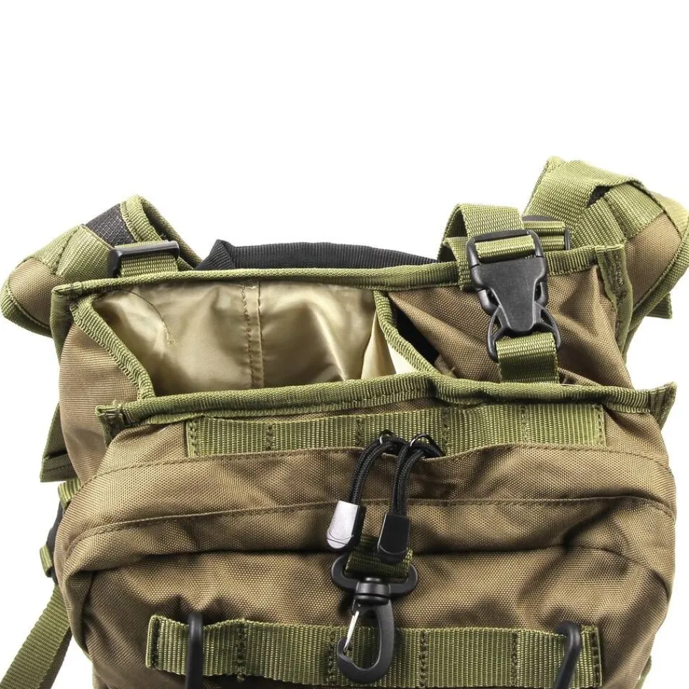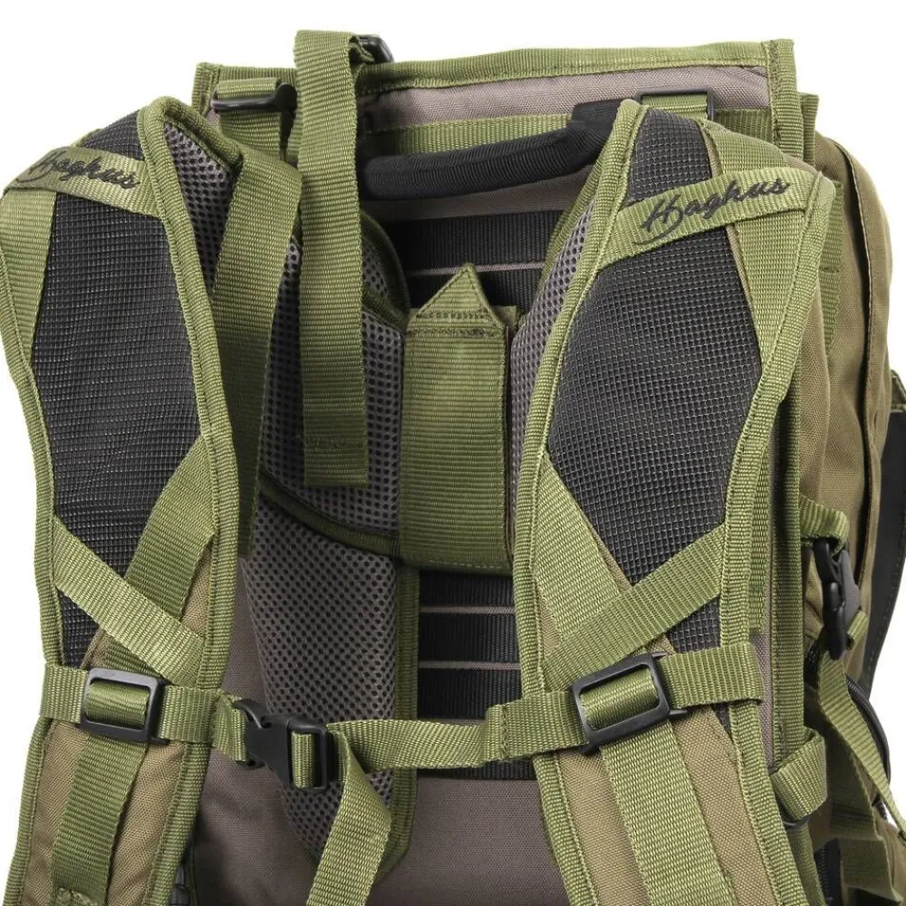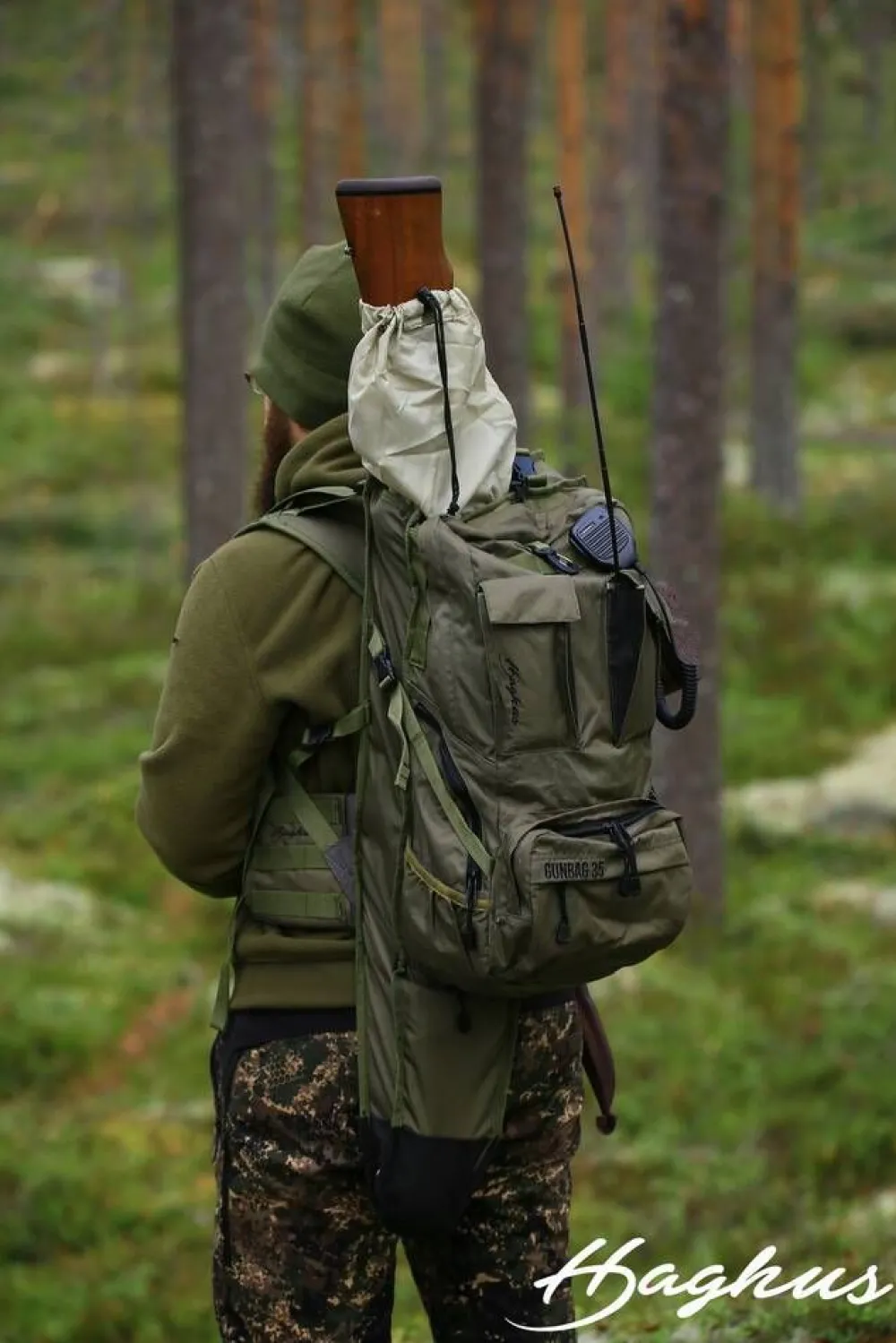 | Repun taskusta löytyy kätevä verkkopussi, jonka voi kiinnittää repun ulkopuolelle. Pussi on tarkoitettu esim. riistan tai likaisten vaatteiden kuljetukseen. Repun kantolaitteessa on monipuoliset säädöt, joiden avulla reppu saadaan optimoitua juuri sopivaksi käyttäjälleen. Lantiovyö lähtee tarvittaessa irti. Repun kaksi etutaskua on kooltaan juuri kiväärinpanoslaatikon kokoiset. Iso etutasku on toimiva monille varusteille, tarvikkeille ja pikkutavaroille. |