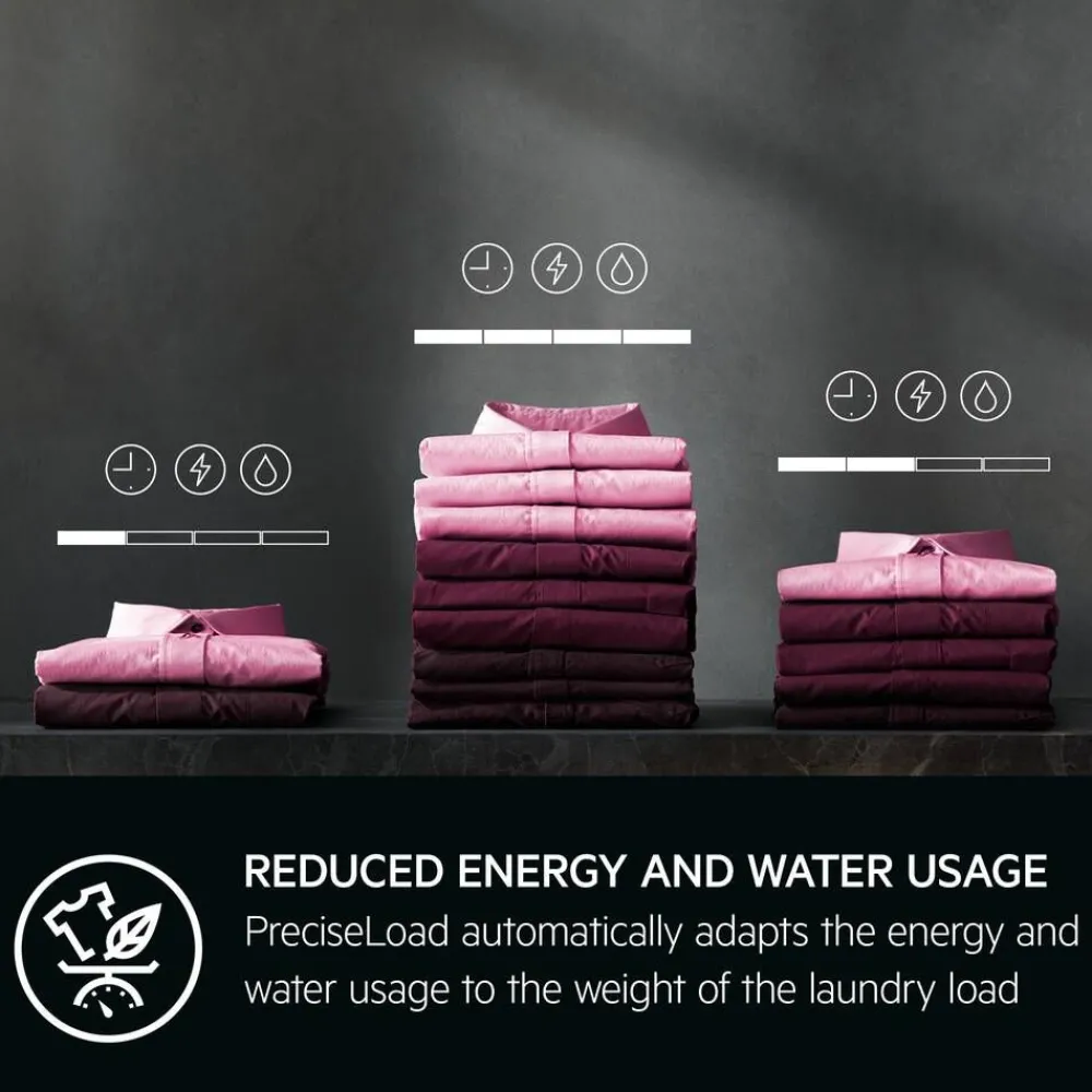 | PreciseLoad mukauttaa automaattisesti pesuohjelman ajan sekä energian ja veden käytön pyykkimäärän koon mukaan. Voit siis käyttää räätälöityjä pesuohjelmia, jotka kuluttavat vähemmän energiaa ja vettä pieniä pyykkimääriä pestäessä. |