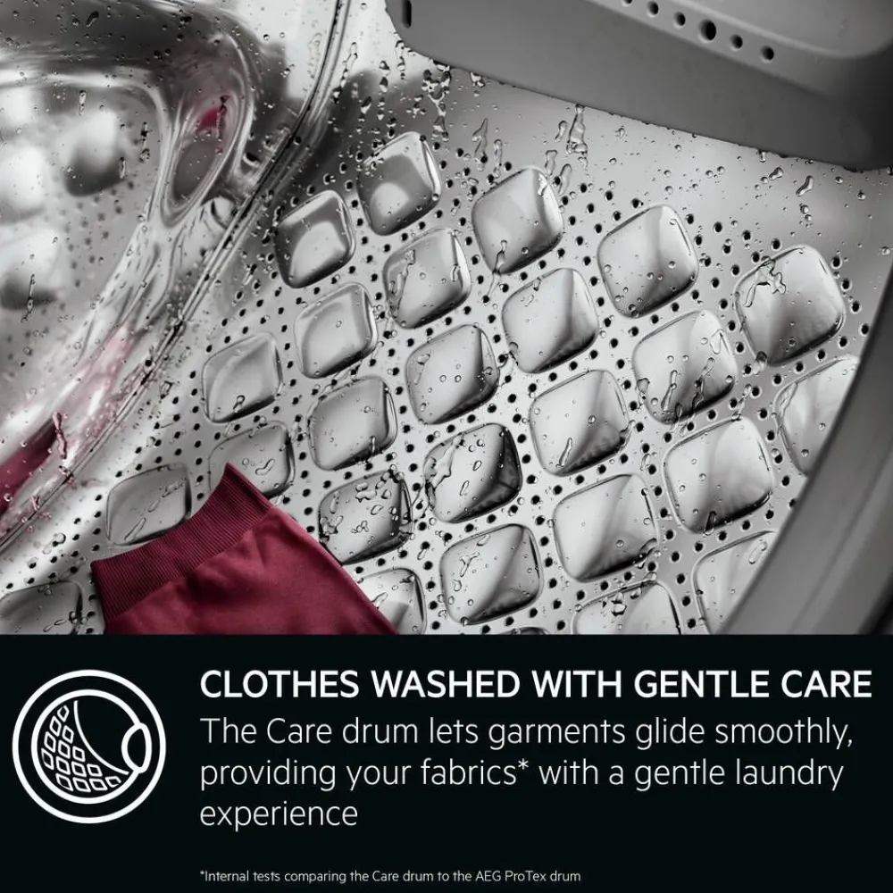 | Care-rummussa vaatteet voivat liikkua tasaisesti korotetun pehmustetun rummun muodon ja optimoidun nostinvivun ansiosta. Ohut vesikalvo peittää reiät pesun aikana. Entistäkin hellävaraisempi pesukäsittely pyykeillesi. |