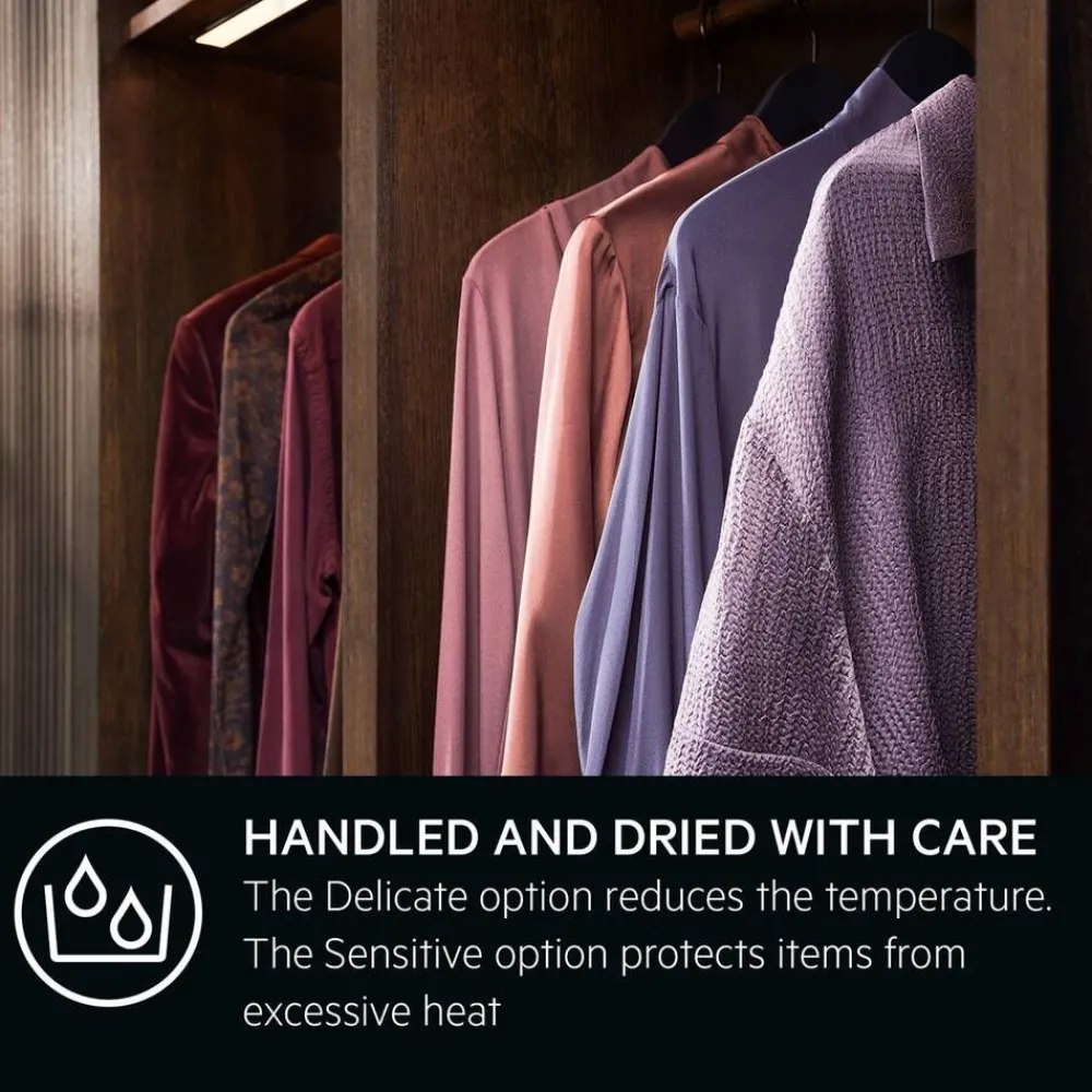 | Automaattiset kuivausohjelmat. Pyykin kuivaaminen käy kätevästi automaattiohjelmilla. Kerrot vain koneelle haluatko esimerkiksi kaappikuivaa tai silityskuivaa pyykkiä ja kone kuivaa vaatteet juuri sopivan kuiviksi. Elektroniset anturit tunnistavat oikean kosteustason automaattisesti – on pyykkiä sitten paljon tai vähän. |