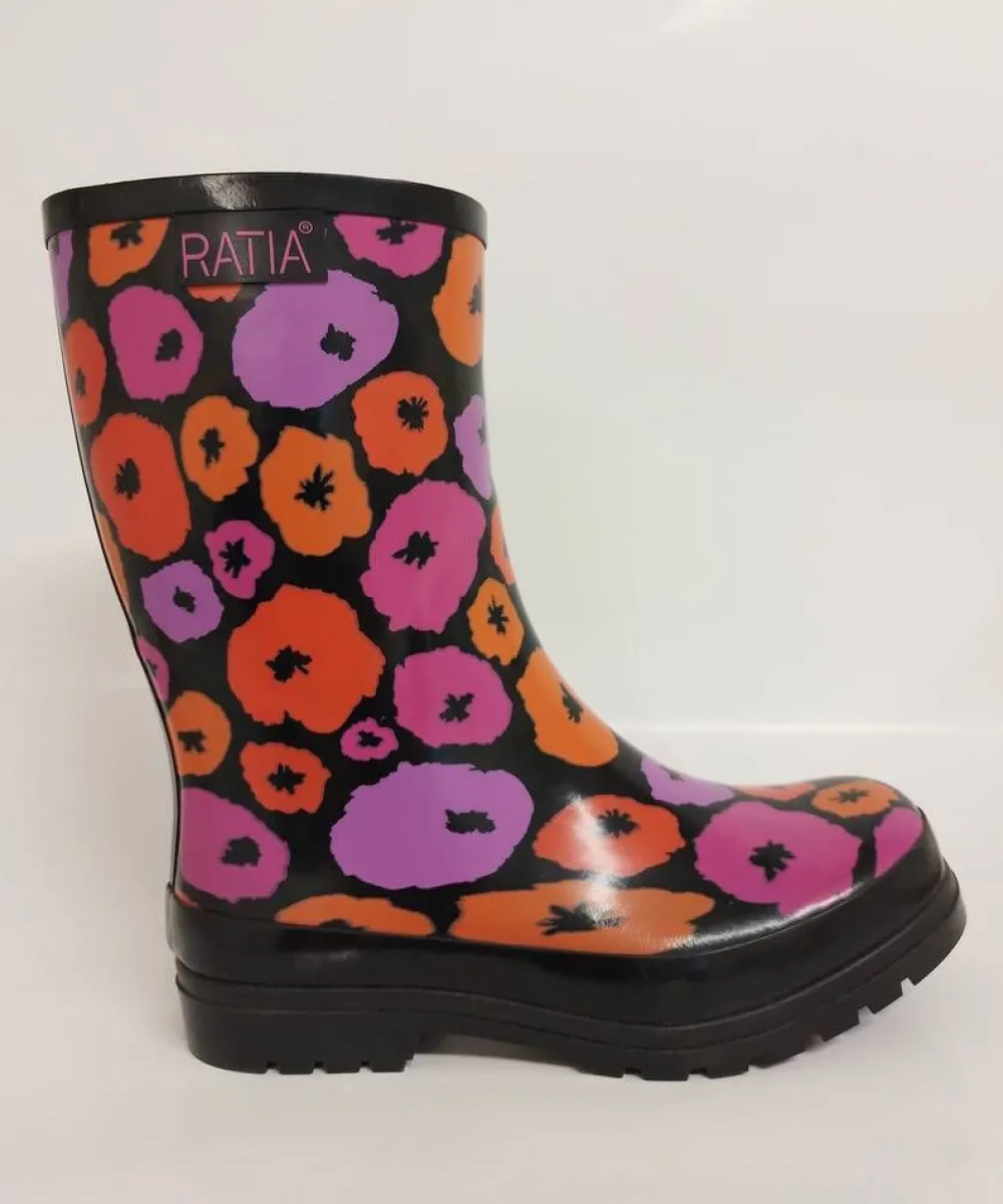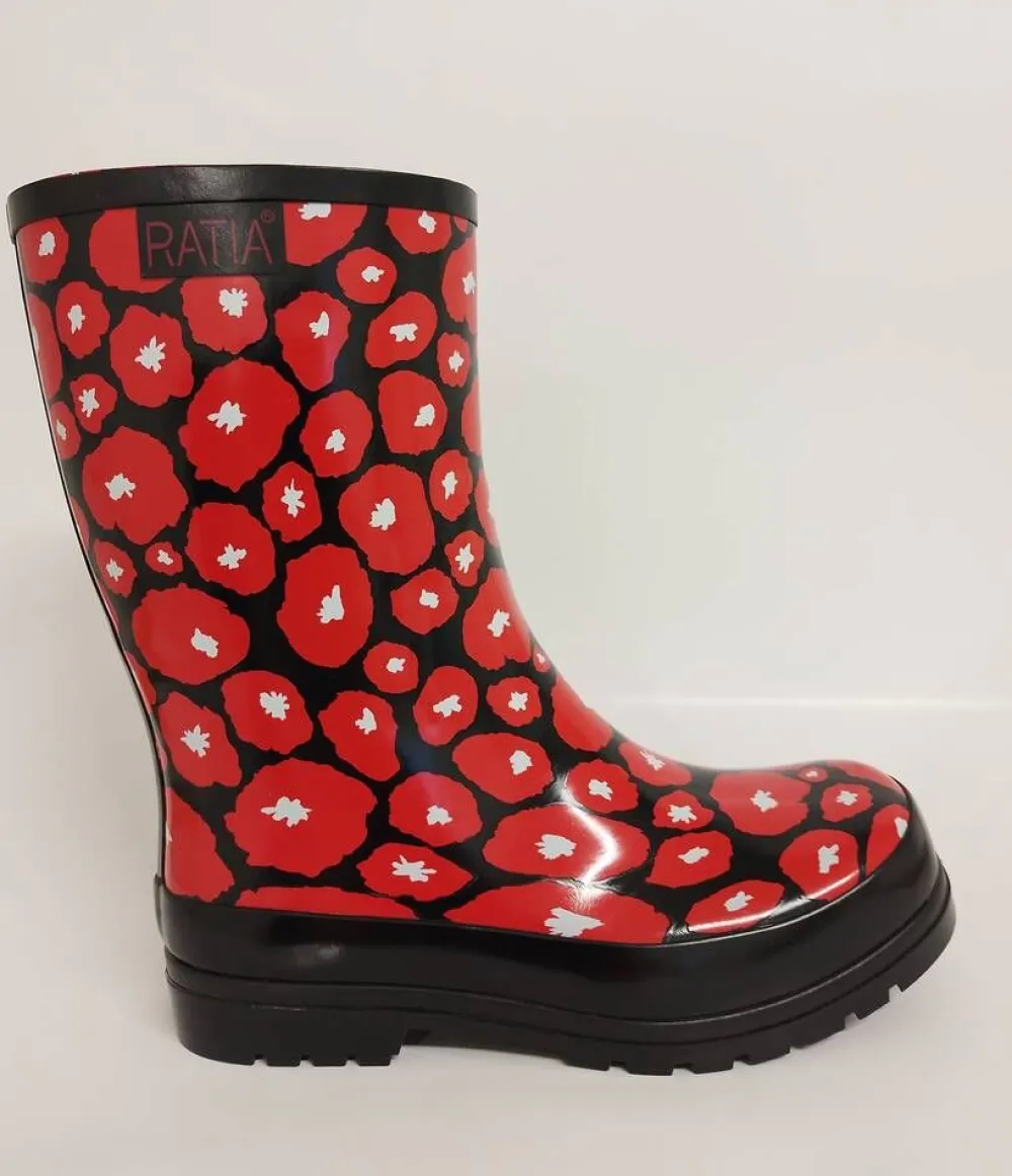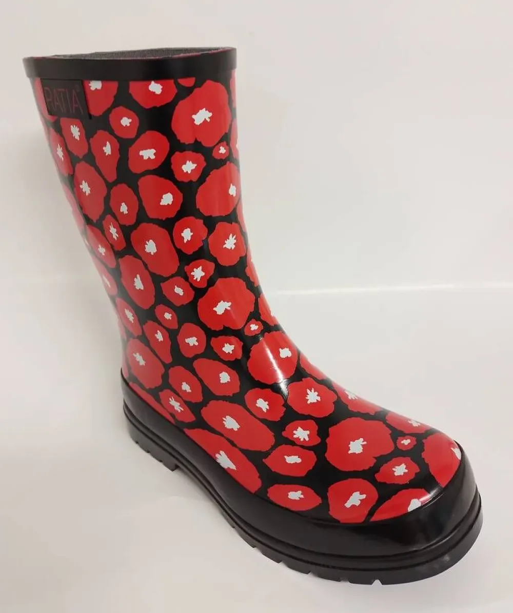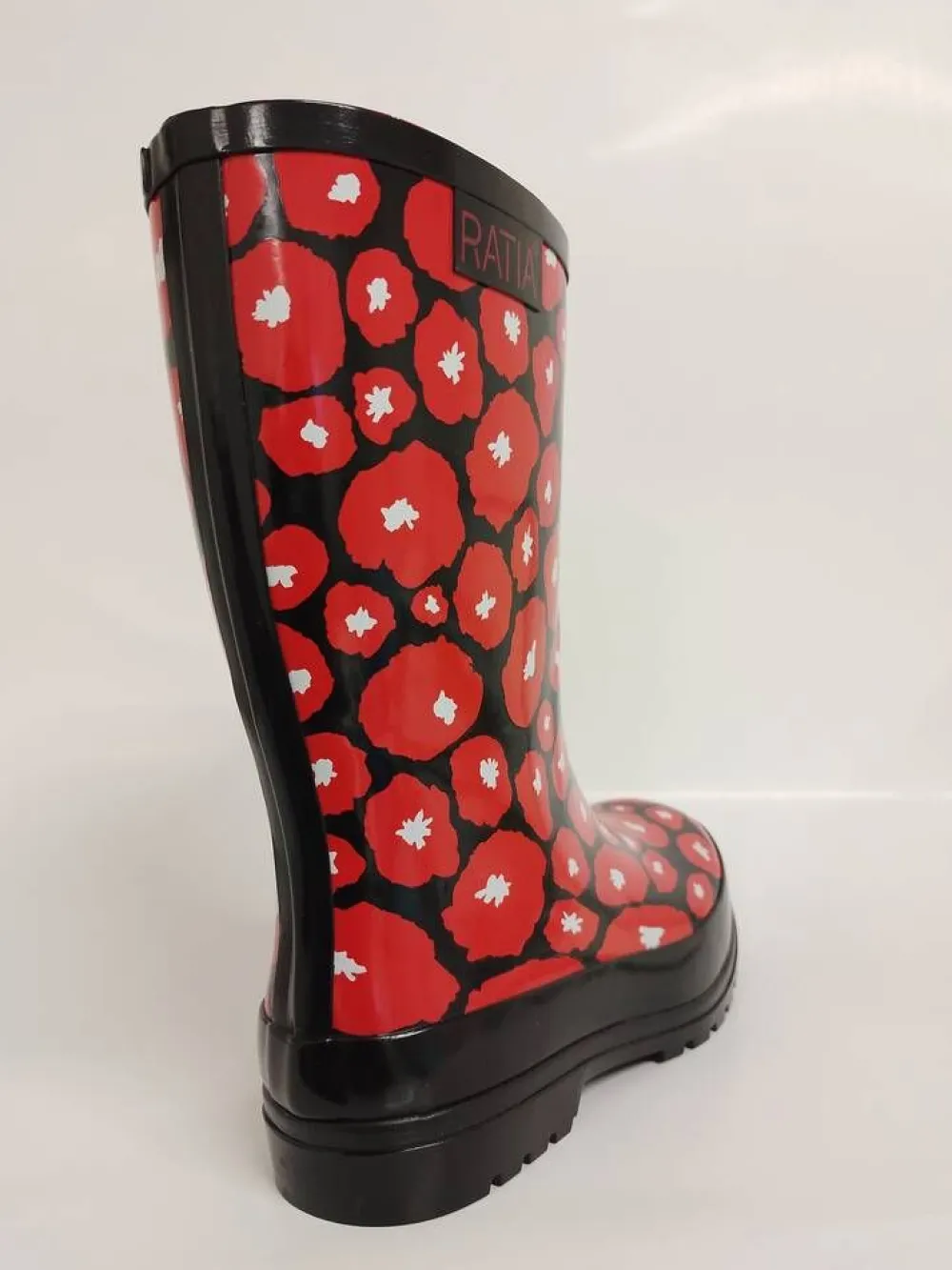 Naisten kumisaappaat tilavalla lestillä ja kauniilla kuviolla.Lisää tietoja