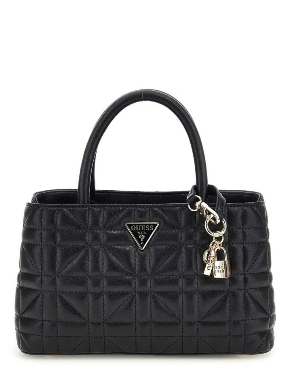 Supertrendikäs kiiltäväpitainen ja elegantti laukku roikkuvilla koristeilla. Koristeellinen tikkipinta ja kolmiologo …