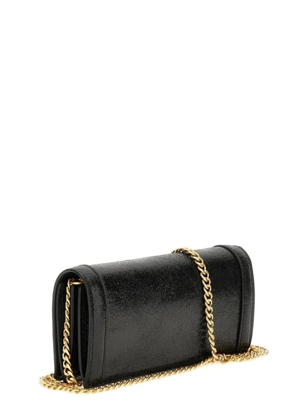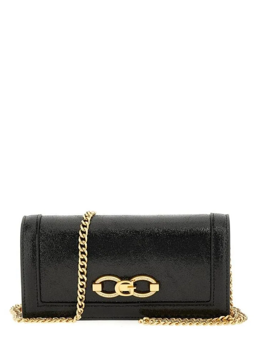 Tyylikäs pikkulaukku metallinhohtoisella pinnalla. Laukussa on kultainen ketjuolkain ja läpässä näyttävä G-korist…