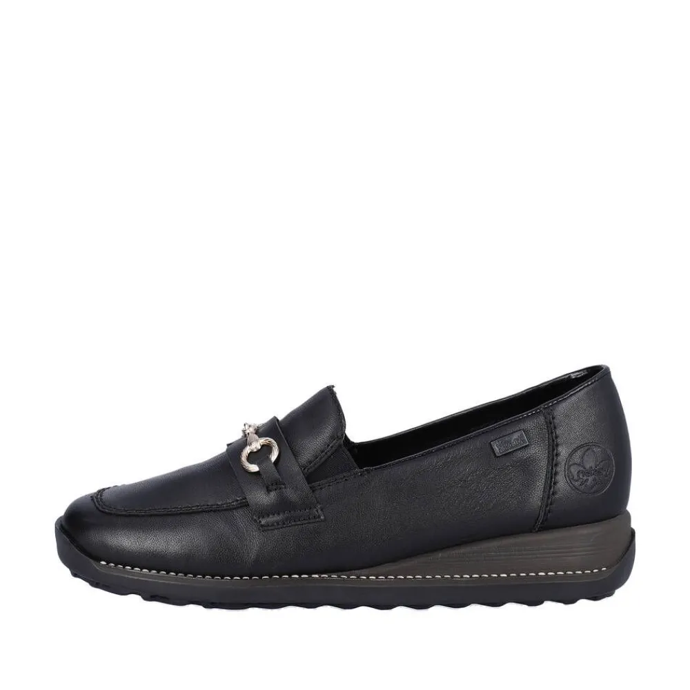 Naisten nahkaiset, kiilakorkoiset kävelykengät, joissa on päällä koristesolki ja RiekerTEX-kalvo. Kapea lesti.Lisä…