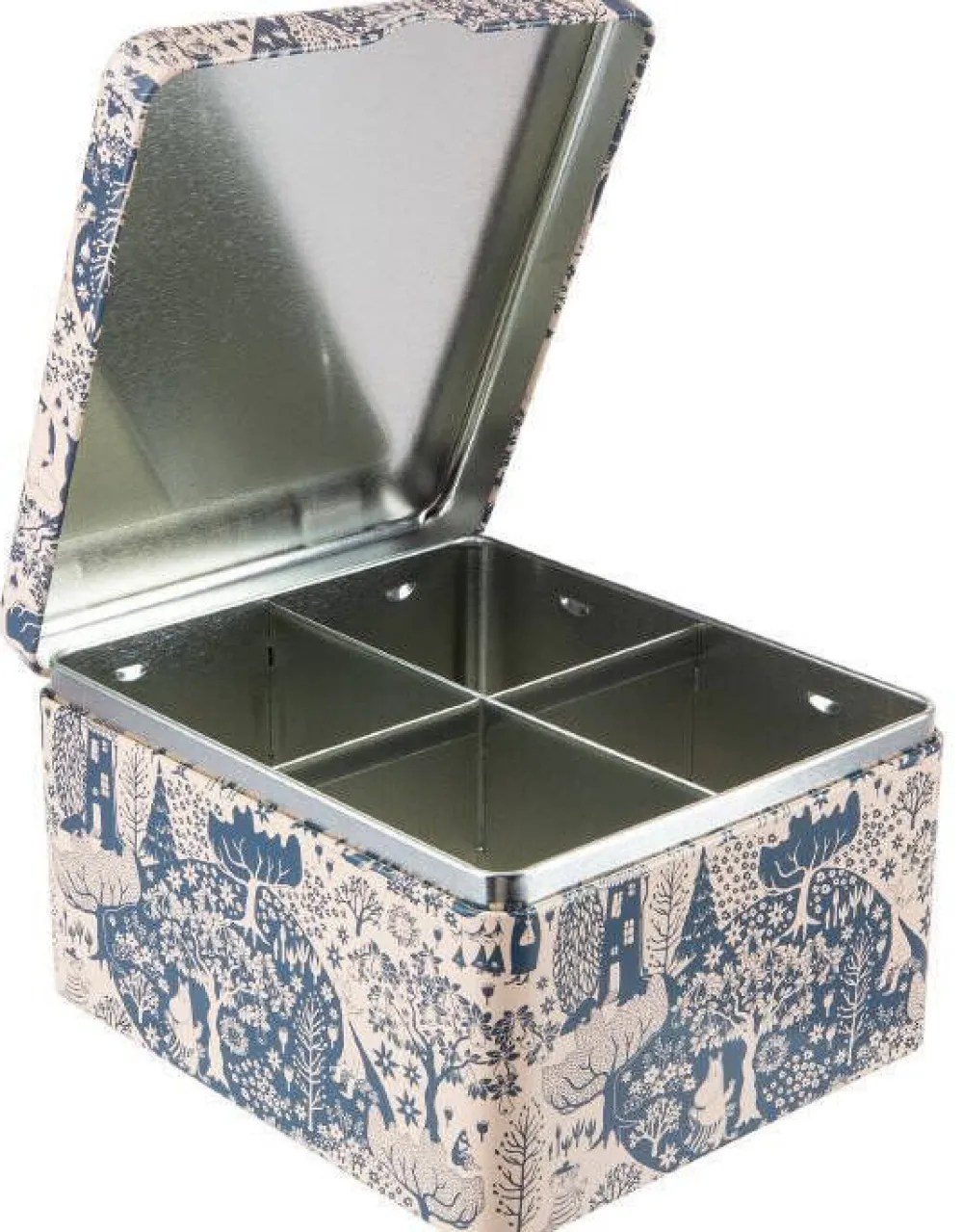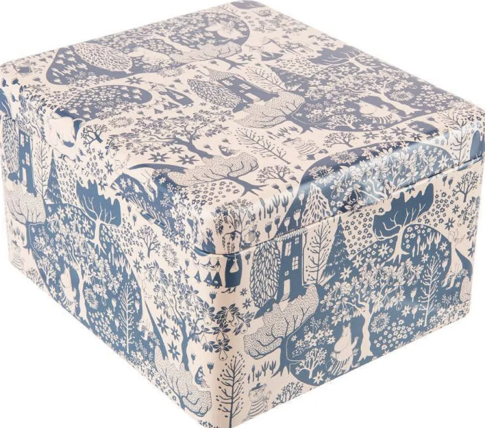 Peltinen lokeropurkki kauniilla ja klassisella Muumikuosilla. Purkissa on saranakansi ja neljä lokeroa. Lokeroiden syvy…