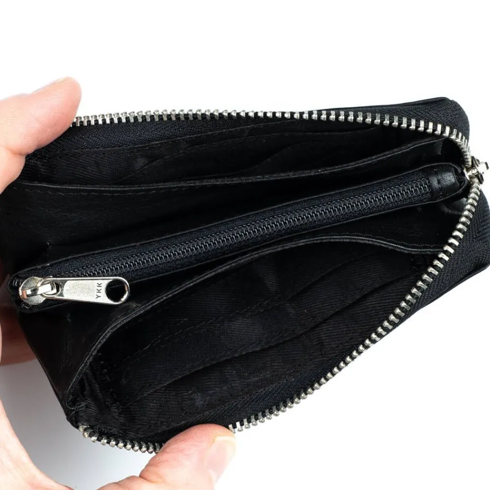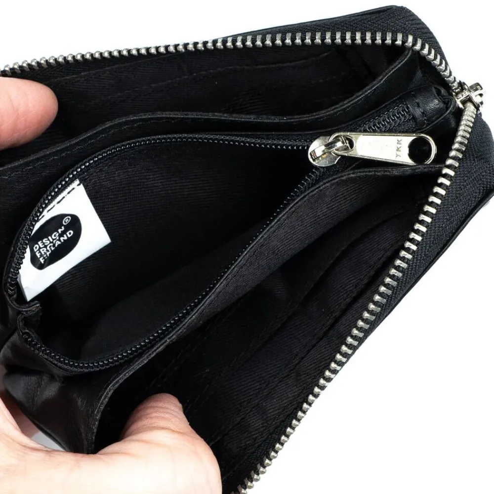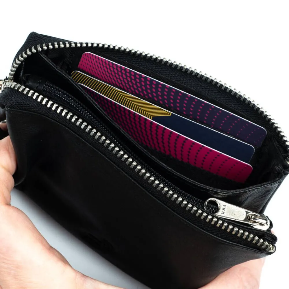 Näpsäkkä pussukkamallinen lompakko nahkapinnalla ja vetoketjukiinnityksellä. Sisäpuolella on kolikkotasku ja kortti…