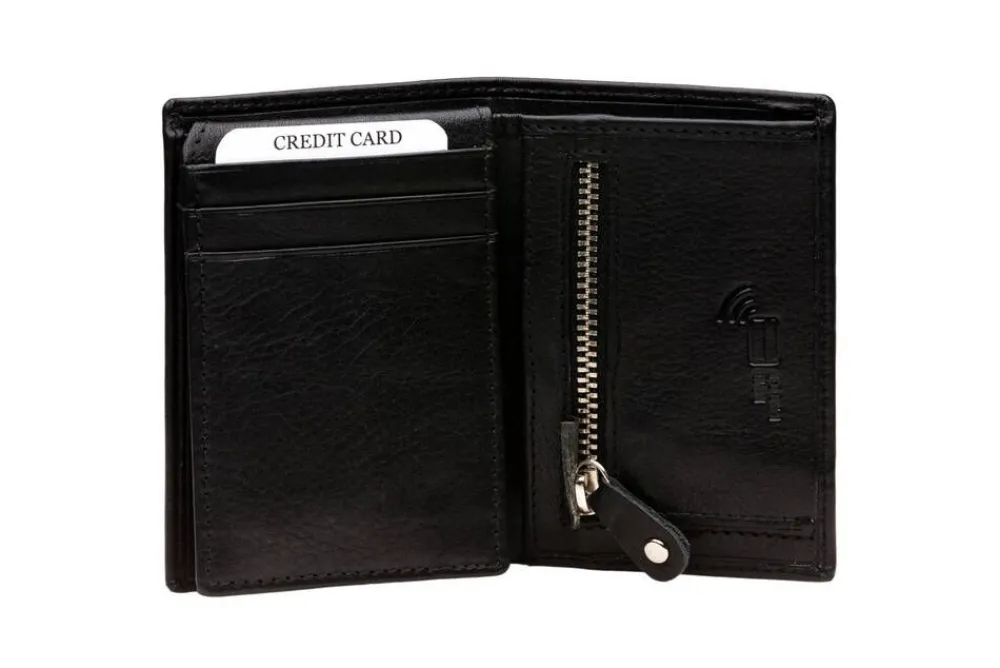 Tyylikäs pieni nahkainen RFID-suojattu lompakko. Ylöspäin nousevassa läpässä ikkunallinen korttipaikka sekä kolme…