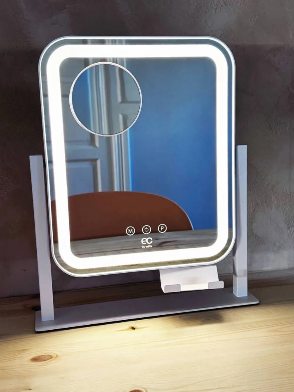 | Peilissä on sisäänrakennettu 1200 mAh litiumakku, jota ladataan mukana tulevalla USB-kaapelilla (USB-A-USB-C). Akku latautuu täyteen 2,5–3 tunnissa, ja peiliä voi käyttää latauksen aikana. Akun ollessa ladattu et tarvitse johtoa, ja peili on helppo ottaa mukaan tai siirtää paikasta toiseen. Täyteen ladattuna käyttöaika jopa 10 päivää (30 minuutin päiväkohtaisella käytöllä) tai 3-4 tuntia täydellä valaistuksella. Kätevä puhelinteline mahdollistaa ohjevideoiden seuraamisen tai sisällön katselun valmistautumisen aikana. |