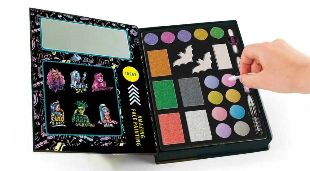 Monster High -meikkisetti sisältää yhteensä 18 väriä (joista 5 kimaltelevaa) luomille ja kasvoille, lilan ja musta…