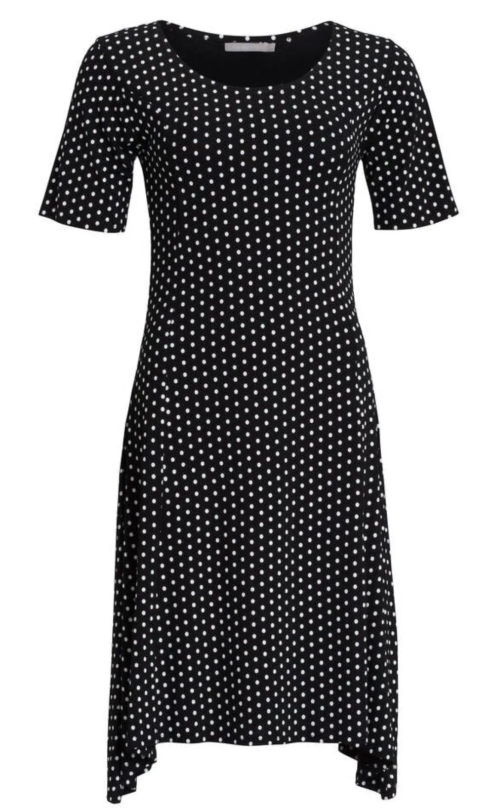 Naisten pilkullinen trikoomekko pyöreällä pääntiellä ja kellohelmalla.Lisää tietojaRinnanympärys (koko S): 70 c…