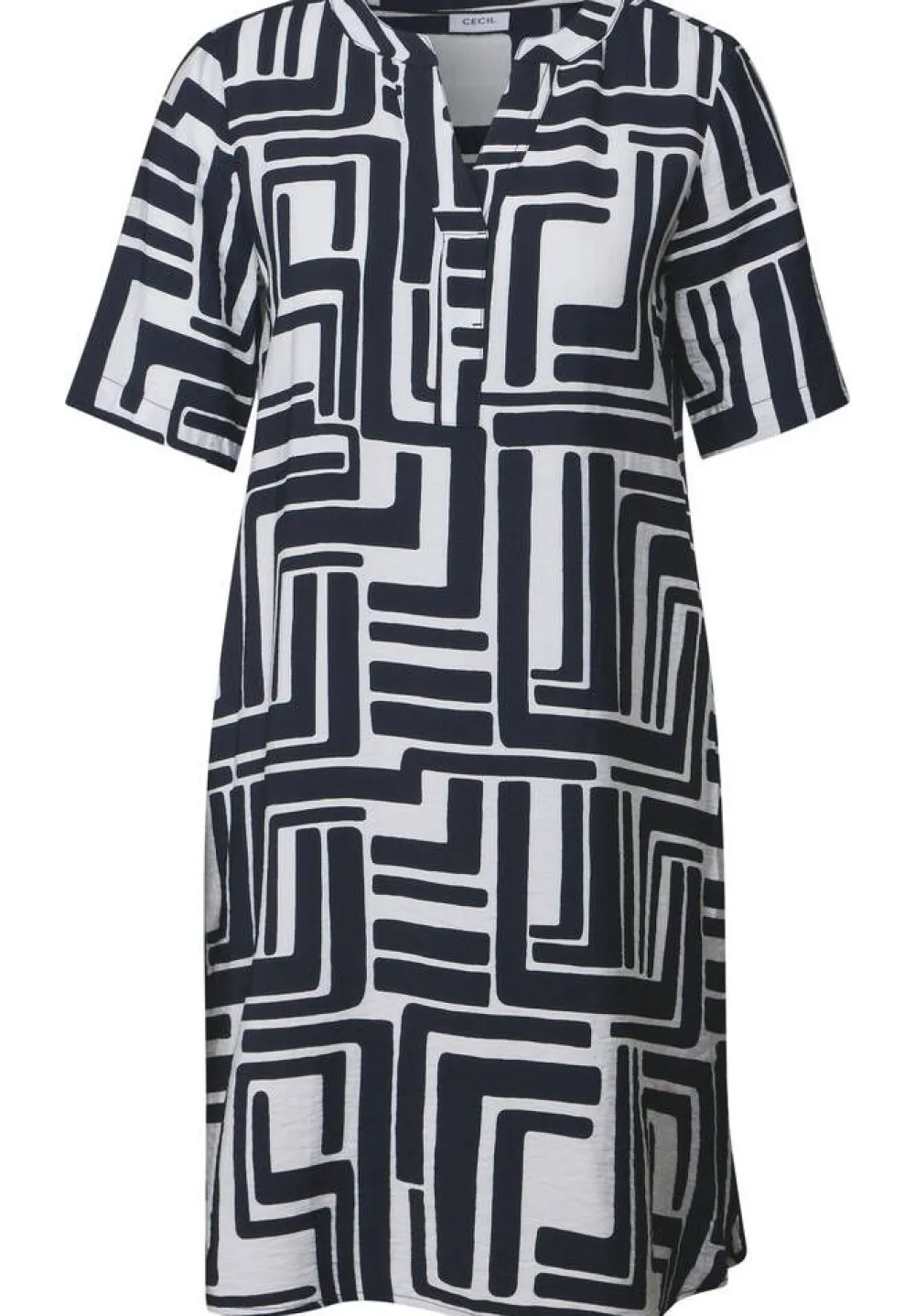 Trendikäs mekko mustavalkoisella graafisella printillä. Mekossa on v-pääntie, 3/4-hihat ja kätevät huomaamattomat …